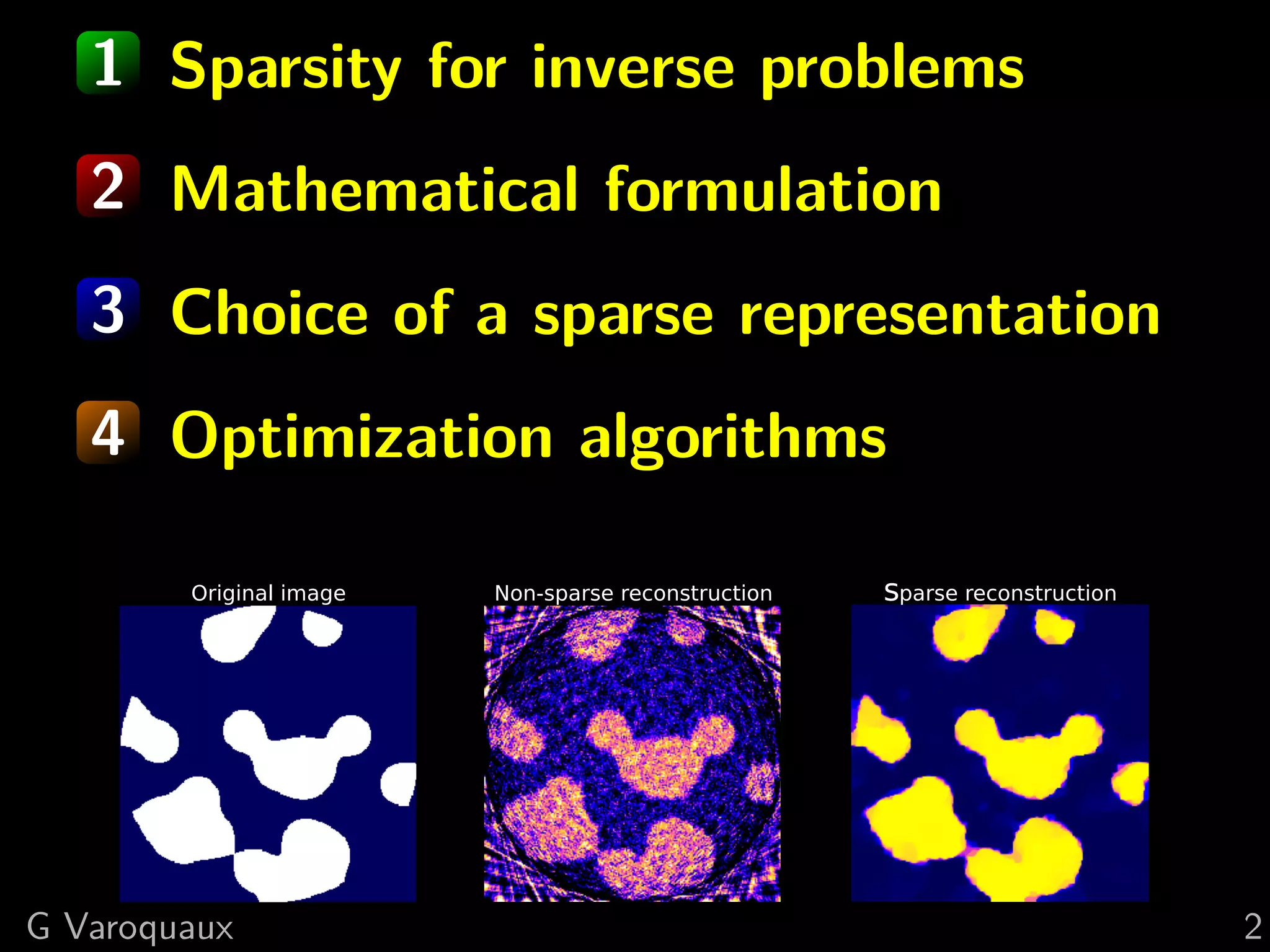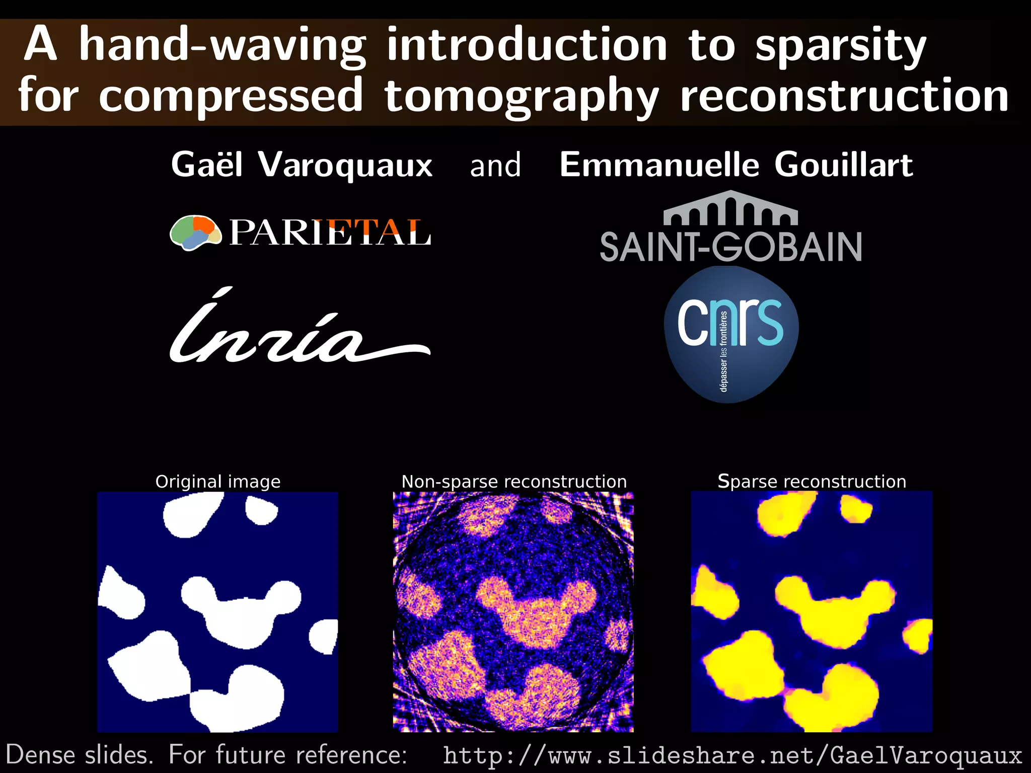 The document provides a hand-waving introduction to using sparsity for compressed tomography reconstruction. It discusses how imposing sparsity can help solve ill-posed inverse problems with limited data by finding sparse solutions. Mathematical formulations are presented using L1-norm minimization and techniques like total variation. Optimization algorithms like iterative shrinkage-thresholding are described, which use proximal operators to handle non-smooth terms in the objective function.