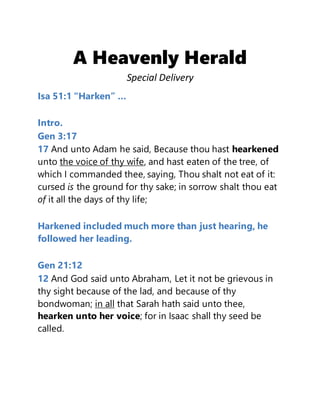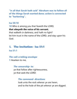 The document presents an interpretation of Isaiah 51, focusing on themes of hearkening to God's voice and following righteousness. It highlights the importance of obedience to divine law and reassures believers of God's eternal comfort and salvation. The concluding message emphasizes perseverance in faith amid worldly struggles, with hope for a divine future.