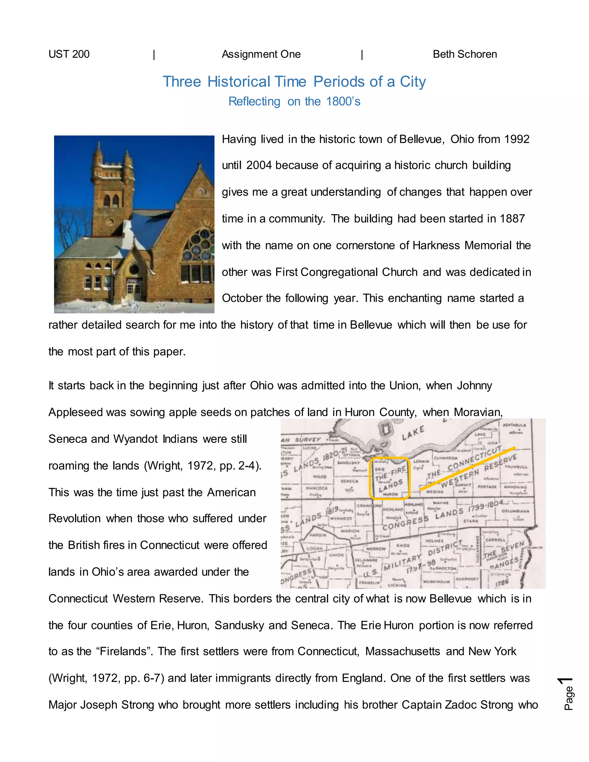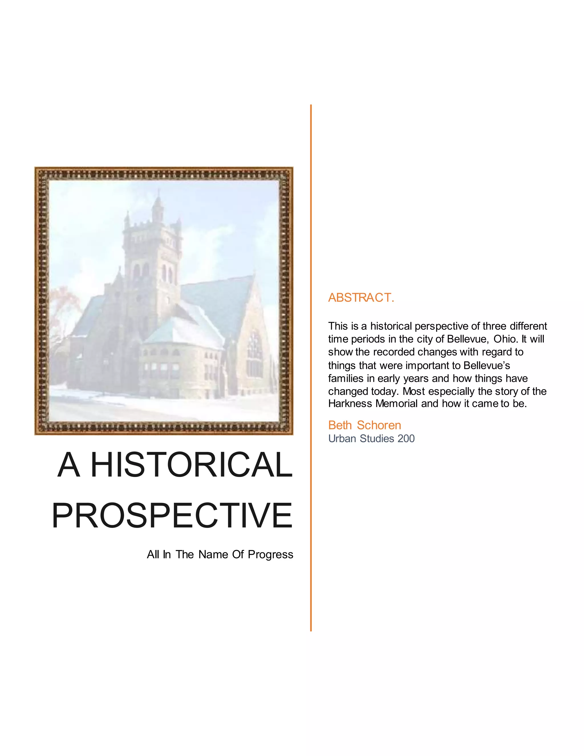 The document provides a historical perspective on Bellevue, Ohio, highlighting significant changes from the 1800s to today, particularly focusing on the Harkness Memorial's origins and the contributions of the Harkness family to the community. Key figures, including various Harkness family members, are discussed in terms of their roles in early settlement, commerce, philanthropy, and community development. It concludes with reflections on the evolution of community structures and institutions, emphasizing the importance of family and goodwill in shaping Bellevue's history.