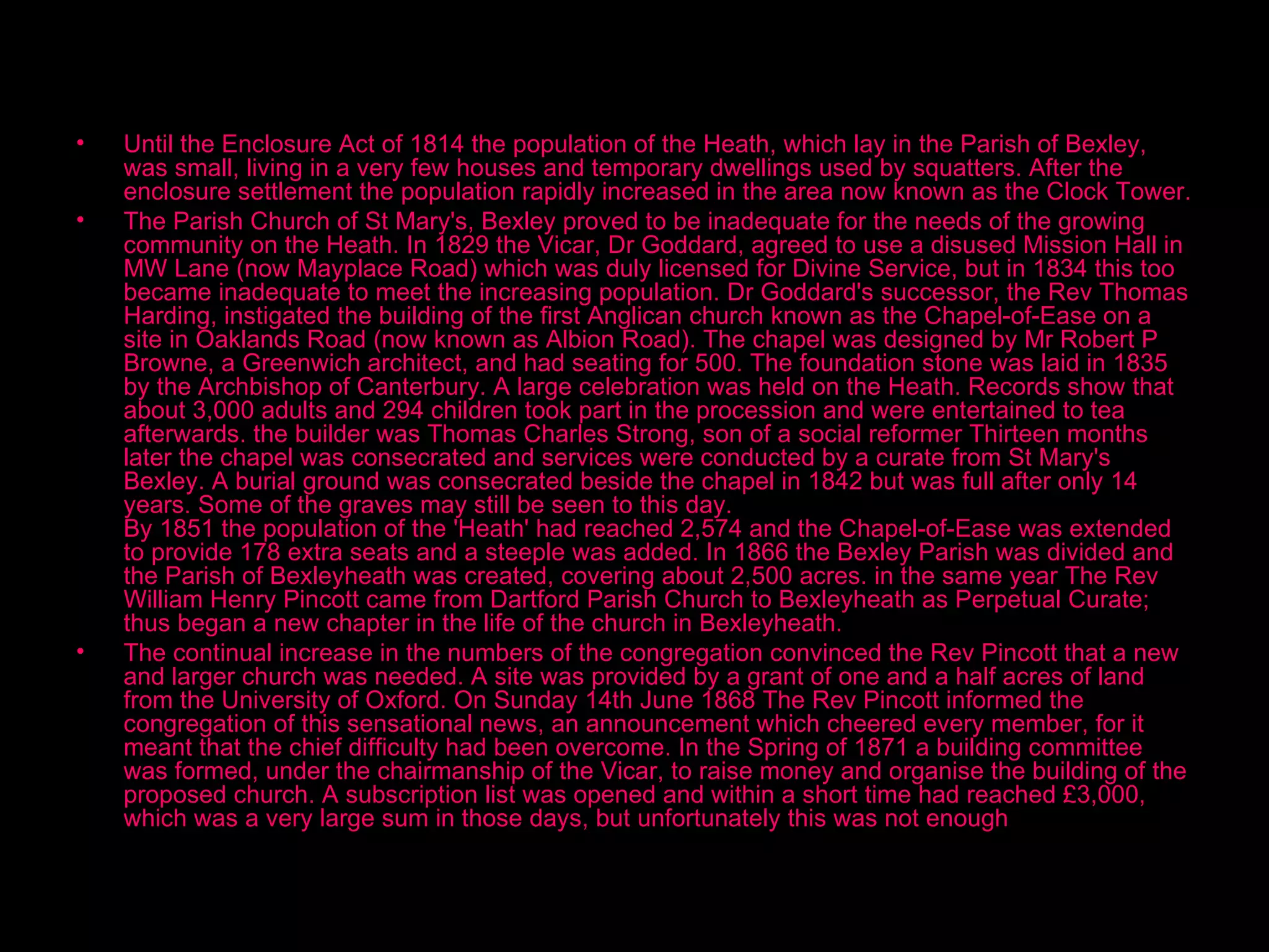 The document provides a history of Bexleyheath in southeast London from the early 19th century. It describes how the population grew after enclosure led to increased settlement in the area. This led to the construction of the first Anglican church, Chapel-of-Ease, in 1835. Continued population growth necessitated building a larger church, Christ Church, in the 1870s, led by Reverend William Pincott. Christ Church was consecrated in 1877 but Pincott died the following year. The church has since undergone several expansions and renovations.