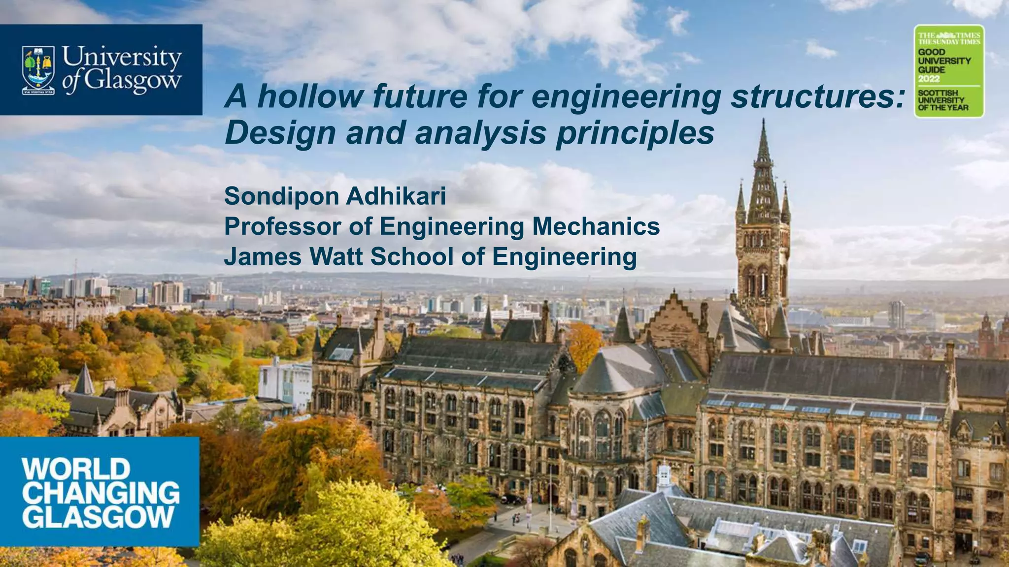 The document outlines the research interests of Professor Sondipon Adhikari in the mechanics of materials and structures, focusing on hollow structures and their advantages for sustainable engineering. It discusses key principles such as equivalent elastic properties, wave propagation analysis, buckling of lattice materials, and elastic tailoring of materials for enhanced performance. The document also references several research works and employs both analytical and machine learning approaches to investigate the behavior of these structures.