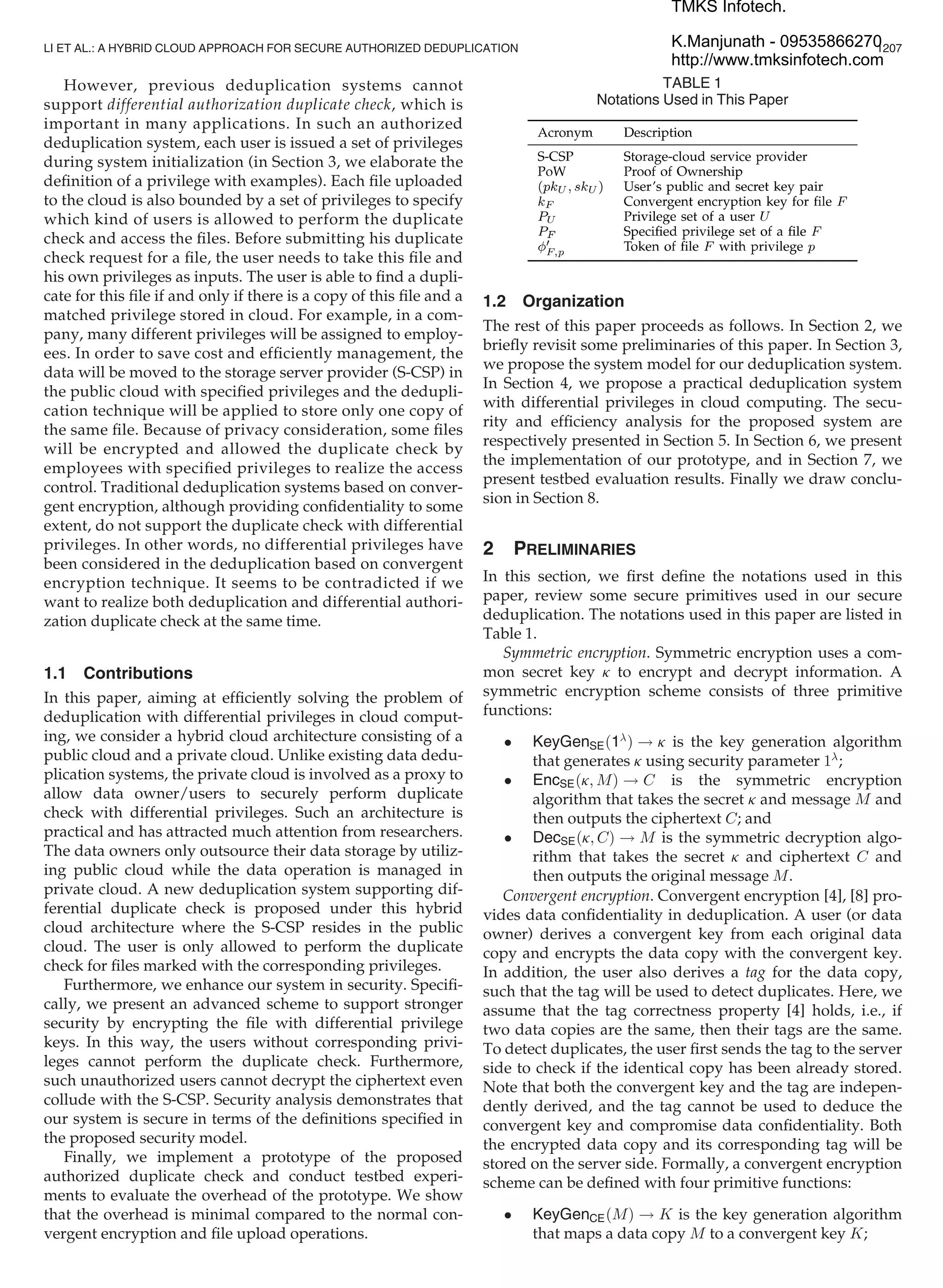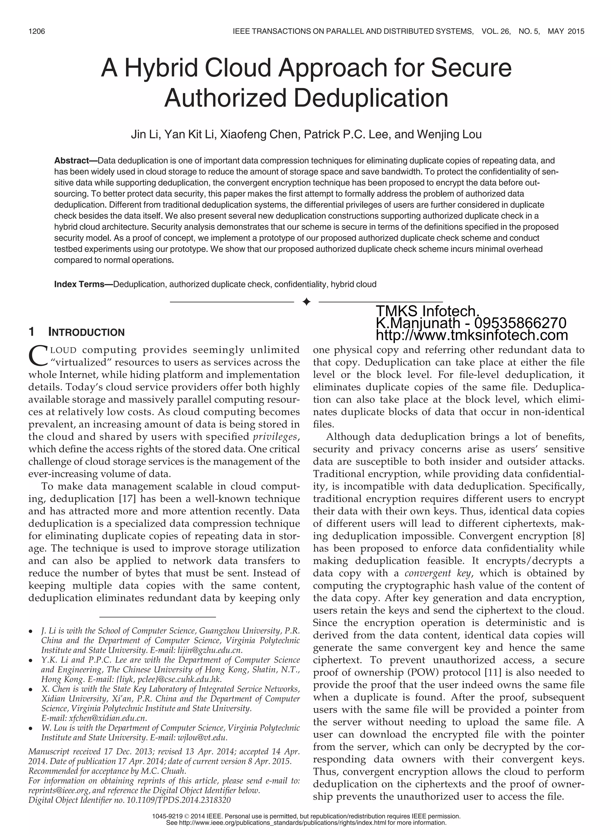 This document proposes a hybrid cloud approach for secure authorized deduplication, addressing the need for data deduplication while ensuring the confidentiality and differential privileges of user access rights. It introduces a new system that allows users to perform duplicate checks on encrypted data based on their assigned privileges, enhancing data security by integrating a private cloud as a proxy. The research includes a prototype implementation and testbed experiments, demonstrating minimal overhead compared to conventional deduplication operations.