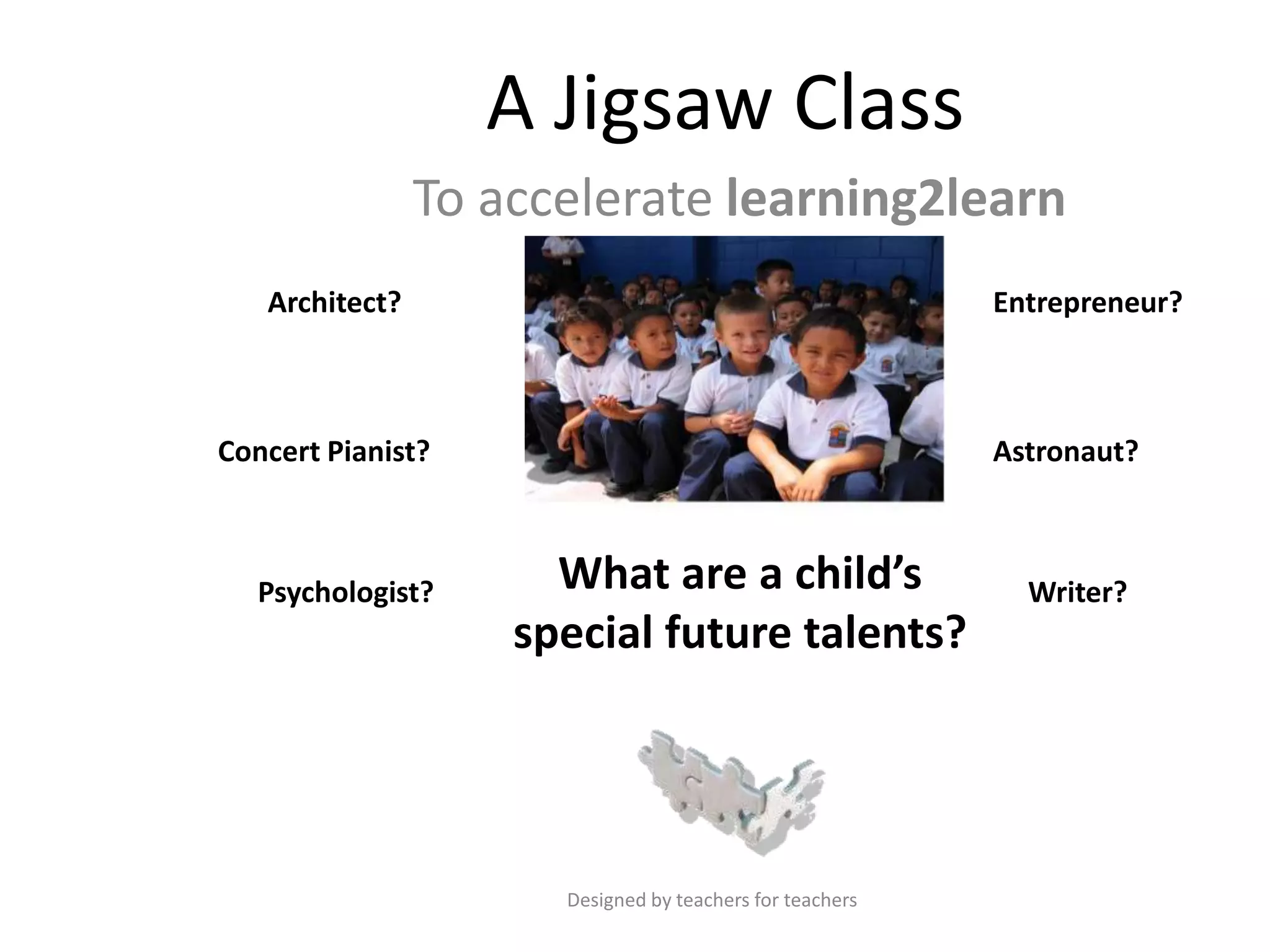 This document describes a "Jigsaw Class" approach for teaching about multiple intelligences. The class is split into groups, with each group becoming experts on one of nine multiple intelligences. The groups research their topic, create a presentation, and teach the other students. This allows students to learn from each other in a collaborative way while catering to different learning styles. The document provides detailed instructions for teachers to implement this approach in their classroom.