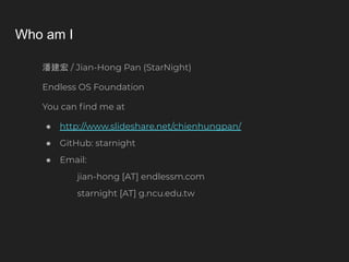 The document outlines the process of booting Endless OS on the Raspberry Pi, focusing on the use of OSTree for system deployment and updates. It discusses the history of Endless OS and its focus on self-learning, alongside technical details about device trees, U-boot bootloader, and the Raspberry Pi boot process. Key points include the transition to a 64-bit system and the methods for deploying device trees using OSTree.