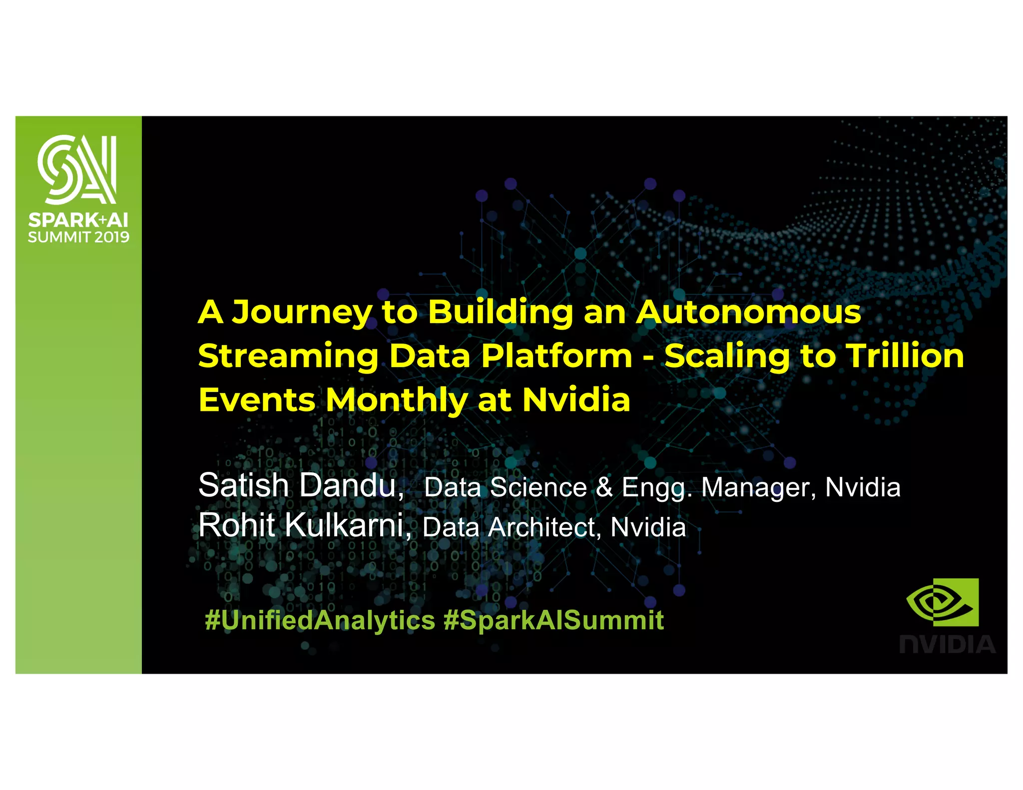 The document presents a detailed overview of Nvidia's autonomous streaming data platform, highlighting its evolution from version 1.0 to 2.0, which includes enhancements in scalability, architecture, self-service capabilities, and security features that accommodate significant data growth. The discussion centers around a data platform-as-a-service model that processes trillions of events monthly while emphasizing lessons learned and innovations in data management and security. The presentation also outlines key features such as automated data tools, bots for data shipping, and self-service applications for efficient data processing.