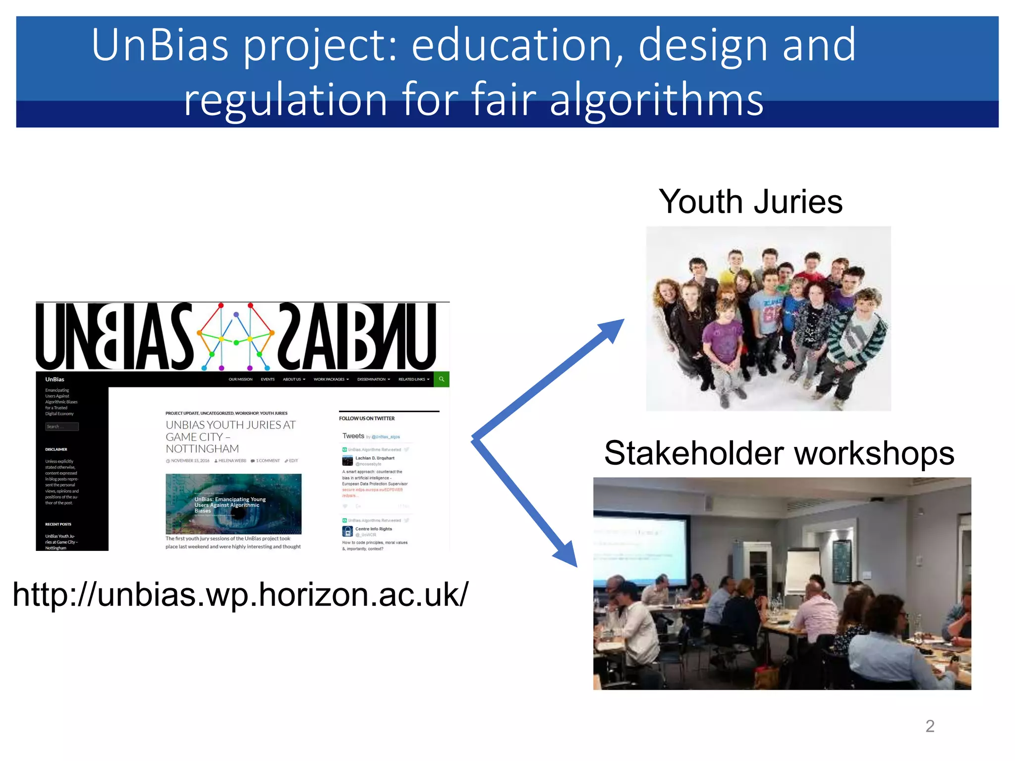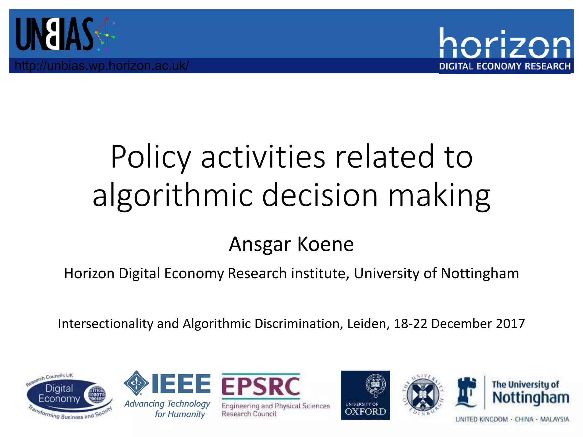 The document outlines various initiatives and standards aimed at addressing ethical concerns in algorithmic decision-making, as presented by Ansgar Koene from the Horizon Digital Economy Research Institute. It discusses the Unbias project, IEEE standards for transparency, data privacy, and algorithmic bias, among others. Additionally, it highlights national and parliamentary efforts to regulate algorithms and the role of major consulting firms in proposing algorithm audits for publicly listed companies.