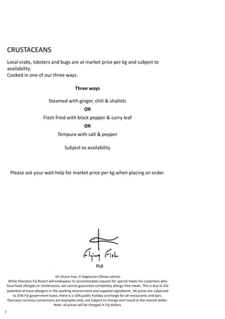 Flying Fish Fiji is a restaurant located at the Sheraton Fiji Resort that serves local Fijian and Australian seafood. It was established in 2008 through a partnership between acclaimed chef Peter Kuruvita and the Starwood Hotel group. Kuruvita draws on his experiences traveling through the Asia Pacific region and childhood in Sri Lanka to flavor the menu, which showcases local Fijian favorites and produce prepared by a talented chef team. The document provides details on Kuruvita's background as an award-winning chef and restaurateur as well as the menu offerings at Flying Fish Fiji.