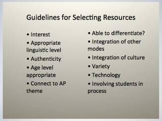 This document summarizes a presentation about finding and using authentic French language resources for AP French Language and Culture courses. It discusses how the AP exam has changed to incorporate more authentic materials from the French-speaking world. It then provides examples of online audio and written resources that can be used, such as podcasts, interviews, articles, advertisements and songs. The presentation also demonstrates different ways teachers can incorporate these materials into their curriculum using technologies like Voicethread, Prezi, Glogster and websites.
