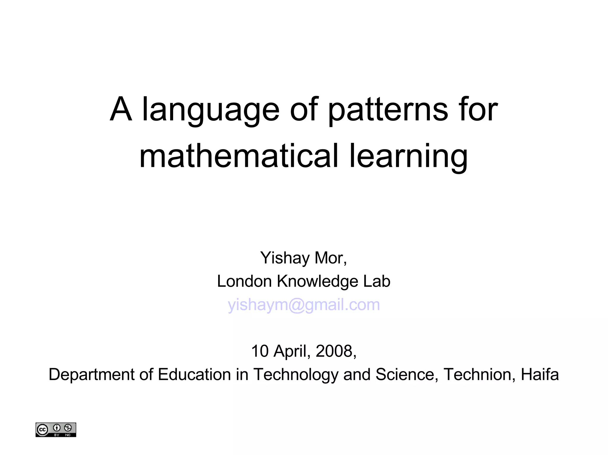 The document discusses design patterns for mathematical learning. It introduces the concept of design patterns that describe recurring solutions to common problems in a way that can be reused in different contexts. The document then provides examples of several design patterns for mathematical learning, including patterns related to mathematical game pieces, soft scaffolding, narrative spaces, objects to talk with, and streams. It aims to develop domain-specific theories to better understand the learning process through design-based research.
