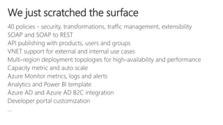 The document outlines API management, highlighting its importance in digital strategies and business operations. It details the different Azure pricing tiers for API management services, including features like secure lifecycle management, monitoring, and support for various use cases. Additional resources for learning and updates on API management are also provided.