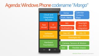 This document provides an overview and agenda for Windows Phone codename "Mango". It discusses hardware foundation updates including sensors, camera, memory and CPU. It also covers software improvements like Silverlight 4 features and performance enhancements. Finally, it demonstrates new APIs for sensors like accelerometer, gyroscope, compass and motion as well as networking, databases and integration of Silverlight and XNA.
