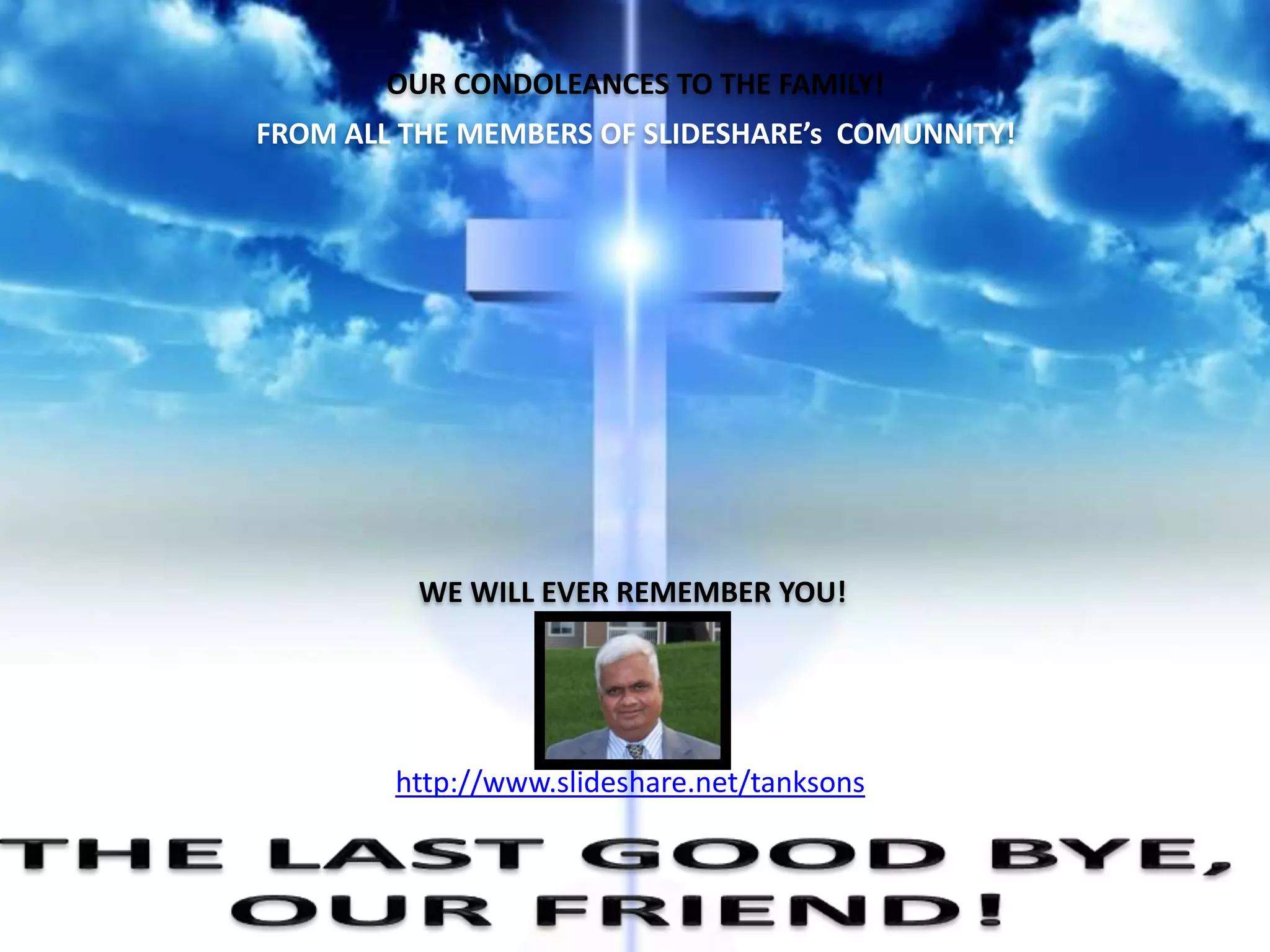A last good bye! 1. OUR CONDOLEANCES TO THE FAMILY!FROM ALL THE MEMBERS OF SLIDESHARE’s COMMUNITY!WE WILL EVER REMEMBER YOU!http://www.slideshare.net/tanksonsTHE LAST GOOD BYE, OUR FRIEND!