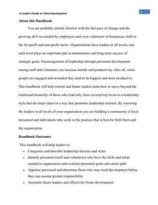 This document provides a summary of leadership theories and strategies for developing talent within an organization. It discusses the importance of leadership and talent development in maintaining organizational success. The document outlines key leadership theories and traits of talented individuals, such as intelligence, motivation, and leadership skills. It also discusses the role of current leadership in identifying and developing future leaders through assessing skills, providing professional development opportunities, and replacing chronic underperformers. The goal is to build a workforce with "competitive capacity" through strategic thinking, coaching, cross-functional knowledge, industry knowledge, and collaboration. A variety of leadership theories are presented, but no single theory is identified as best, and a contingency approach is recommended to account for all situational factors.