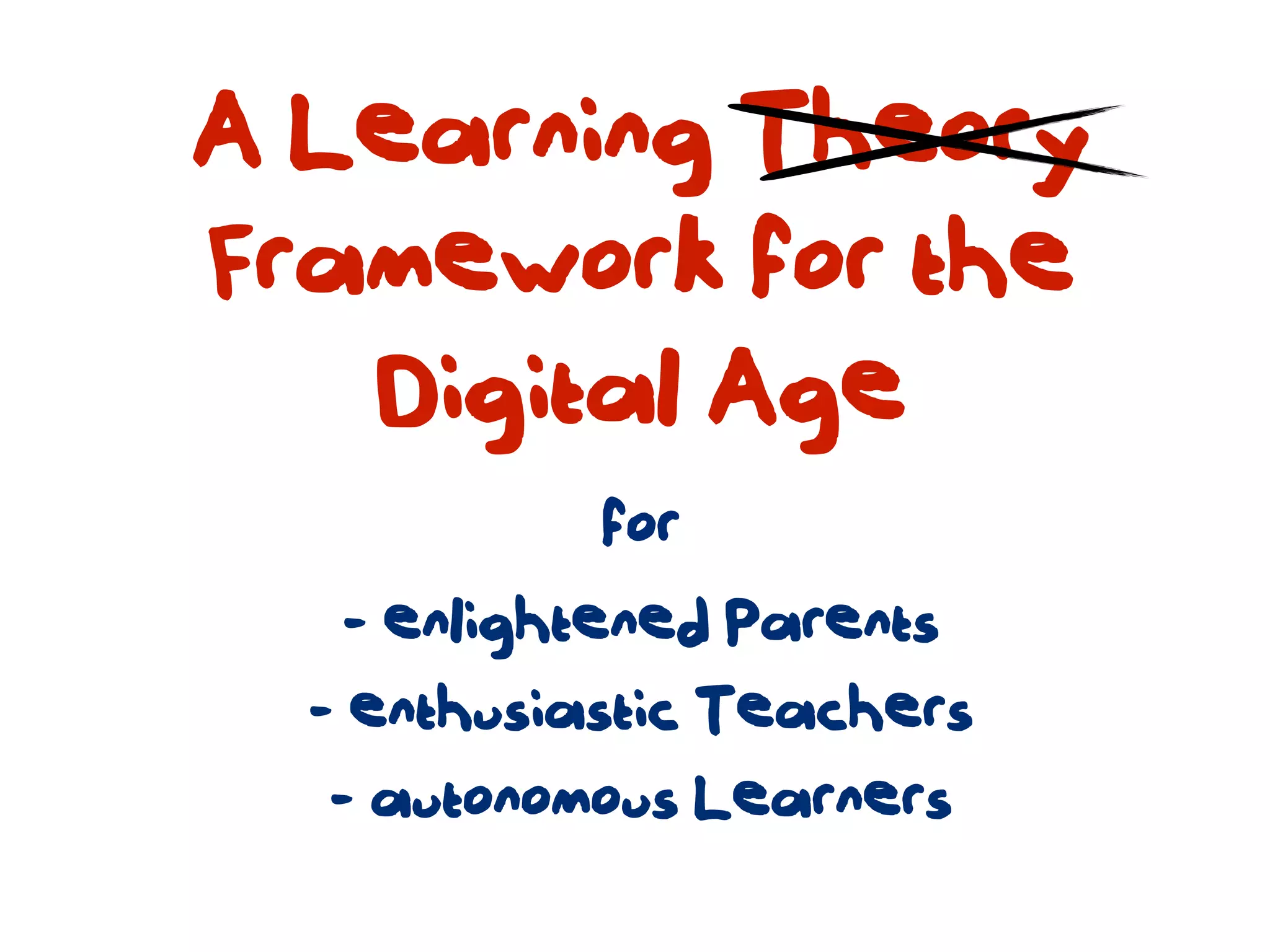 The document discusses a framework for web-based learning that draws from various learning theories and positions the teacher as a learner facilitator, the web as the classroom, and the learner as autonomous. It also outlines the roles of the learner facilitator in understanding learners, curating content, bringing coherence, and co-exploring with learners based on cognitive, social, and constructivist learning theories. The framework aims to integrate formal education with informal, connection-centric web-based learning.