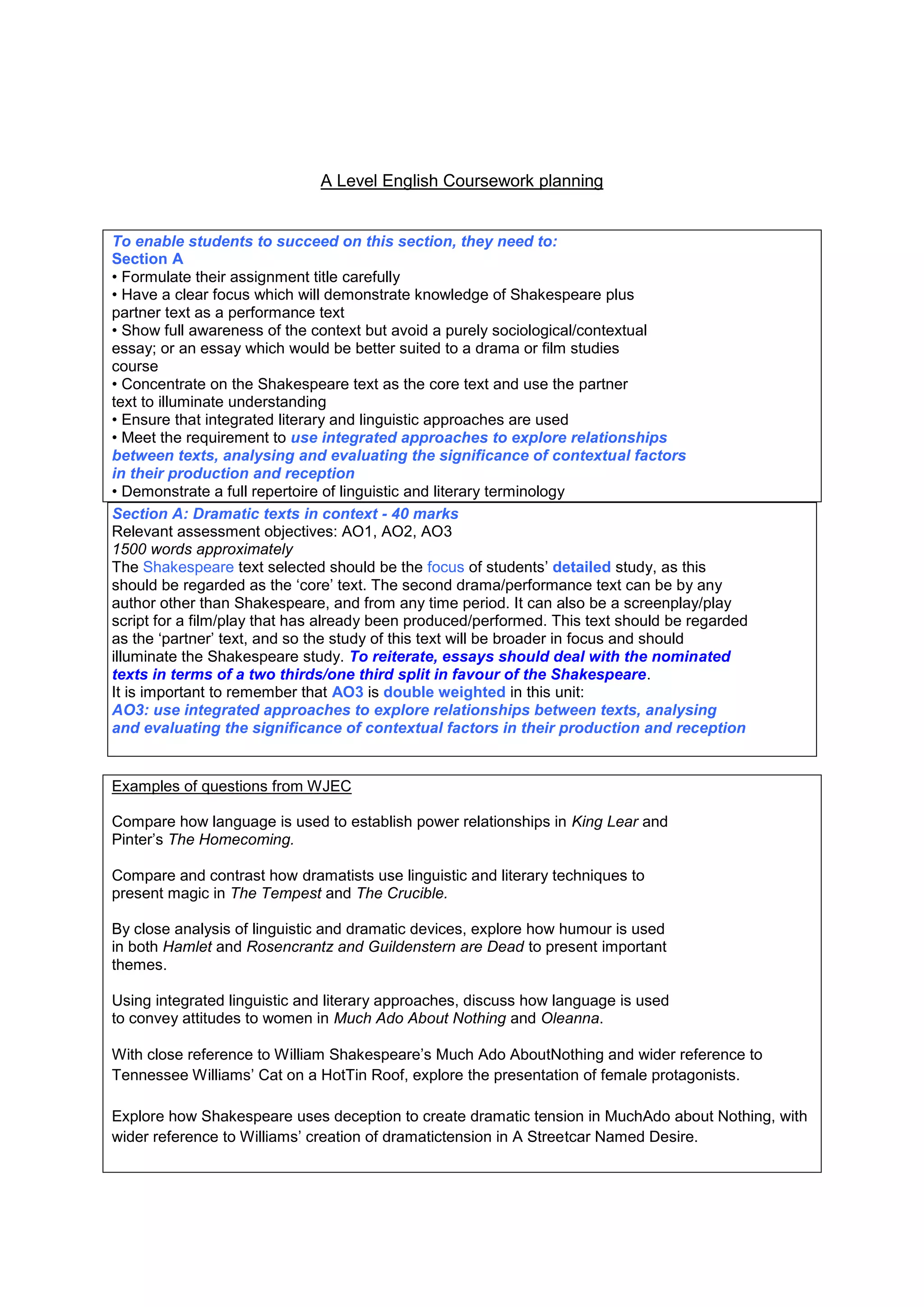 This document provides guidance for students on completing a Level English coursework assignment on dramatic texts in context. It outlines the requirements for Section A, which involves a comparative analysis of a Shakespeare text and a second drama or performance text. Students must focus primarily on the Shakespeare text, using the partner text to illuminate their understanding. They are advised to use integrated linguistic and literary approaches to explore relationships between the texts and evaluate the significance of contextual factors. Example essay questions are also provided focusing on comparative analysis of language, themes, and presentation of characters in selected Shakespeare and other dramatic works.