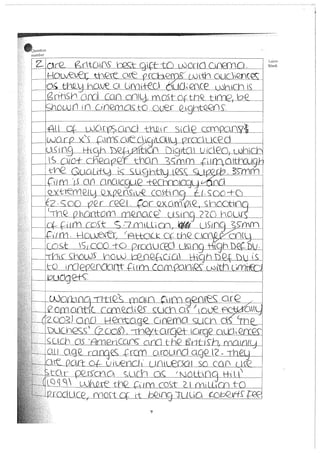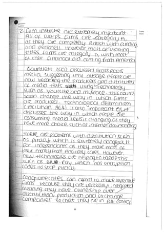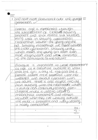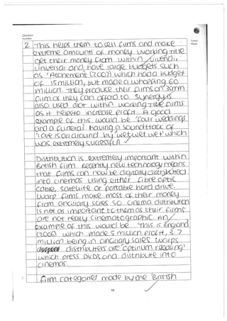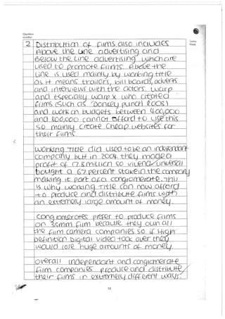 This document provides an analysis and commentary on two responses to exam questions about media representation and film production/distribution. For question one, about representation in a film clip, the response demonstrated good use of mise-en-scene and technical elements to analyze age and representation. For question two, about funding and distribution for independent and major studio films, the response compared practices of Warp Films and Working Title Films, discussing the impact of funding sources and digital technology. The commentary assessed both answers as strong, with good use of examples and terminology to support detailed explanations.