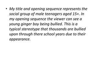 The document discusses how the title and opening sequence of a media product represents the social group of male teenagers aged 15+. Specifically:
