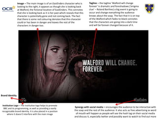 This document analyzes soap opera promotional posters for EastEnders. It discusses several key elements of the posters including the taglines, images, institution logos, and use of social media hashtags. The taglines are meant to be dramatic and foreshadow major upcoming events. The images typically feature characters looking back at key locations with concern. Institution logos help promote the BBC brand while social media integration encourages audience interaction online. These elements are intended to pique audience interest and draw them into following the dramatic stories and changes coming to the fictional town of Walford.