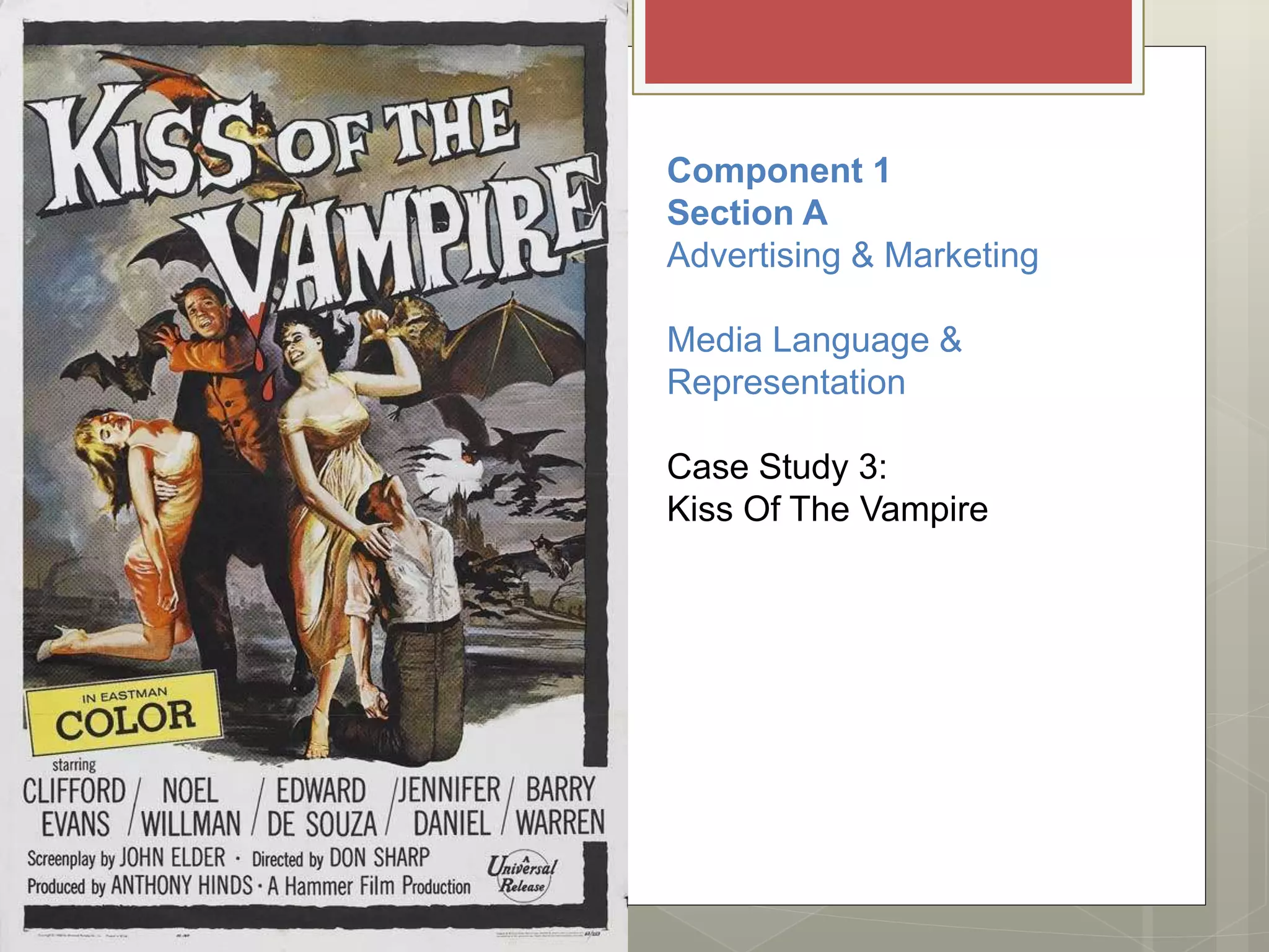 This document provides context and analyzes representations in the 1963 film Kiss of the Vampire. It is a horror/monster movie produced by Hammer Film Productions and intended as a sequel to Dracula, though it does not reference Stoker's character. Released in 1963, the film reflects the social changes of the 1960s including women's liberation and the introduction of the contraceptive pill. However, the poster depicts stereotypical representations of women as passive victims threatened by the vampire that may encode "older" or "male fears" about women challenging male dominance. The document discusses applying various media theories to analyze representations and identities in the poster.