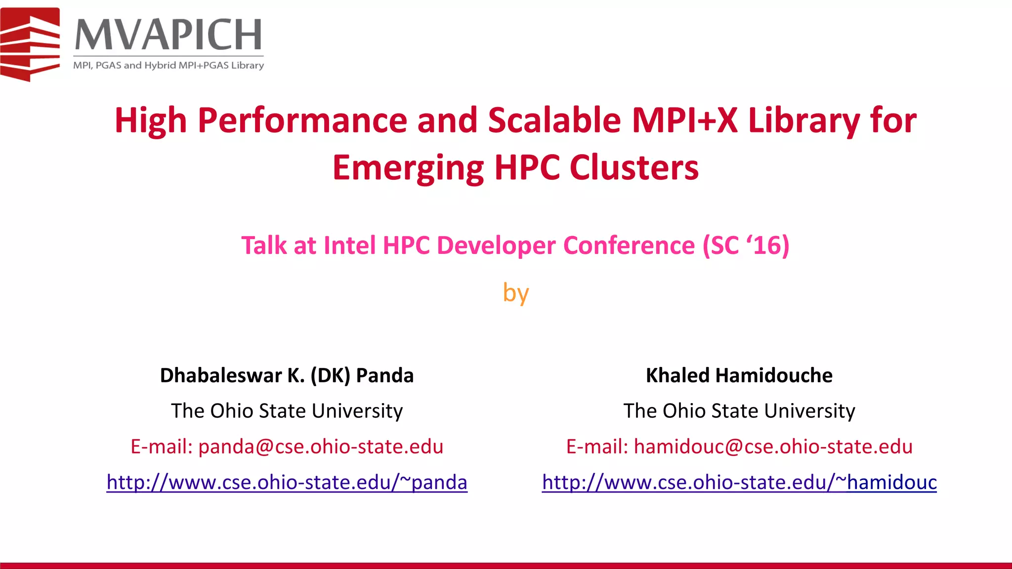 This document discusses the challenges of developing communication libraries for exascale systems using hybrid MPI+X programming models. It describes how current MPI+PGAS approaches use separate runtimes, which can lead to issues like deadlock. The document advocates for a unified runtime that can support multiple programming models simultaneously to avoid such issues and enable better performance. It also outlines MVAPICH2's work on designs like multi-endpoint that integrate MPI and OpenMP to efficiently support emerging highly threaded systems.