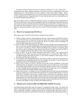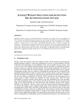 This paper investigates de-authentication attacks in wireless local area networks (WLANs) and proposes a lightweight solution to detect these attacks using algorithms based on radio-tap header information. It highlights vulnerabilities in WLAN security protocols and discusses the exploitation of unencrypted de-authentication frames by attackers to disrupt communication between clients and access points. The proposed method involves a monitoring station programmed in Python that captures and analyzes wireless traffic to identify potential de-authentication attacks.