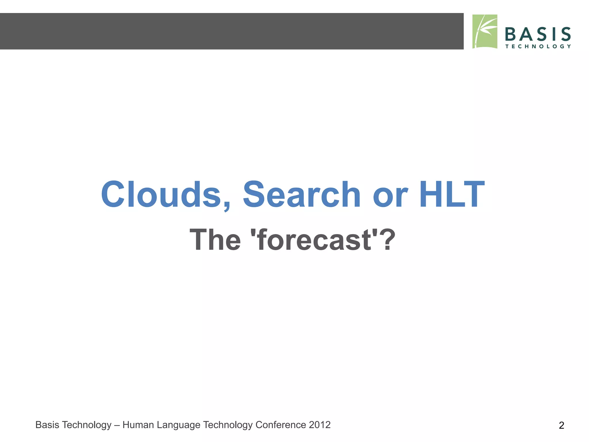 This document discusses the challenges and solutions related to processing large datasets and search functionalities in cloud environments, particularly in the context of Human Language Technology. It highlights how conventional technologies can scale and the limitations of current solutions like Hadoop for real-time processing and complex data interoperation. Additionally, it addresses the importance of deploying efficient backend processes to avoid data bottlenecks in cloud systems.