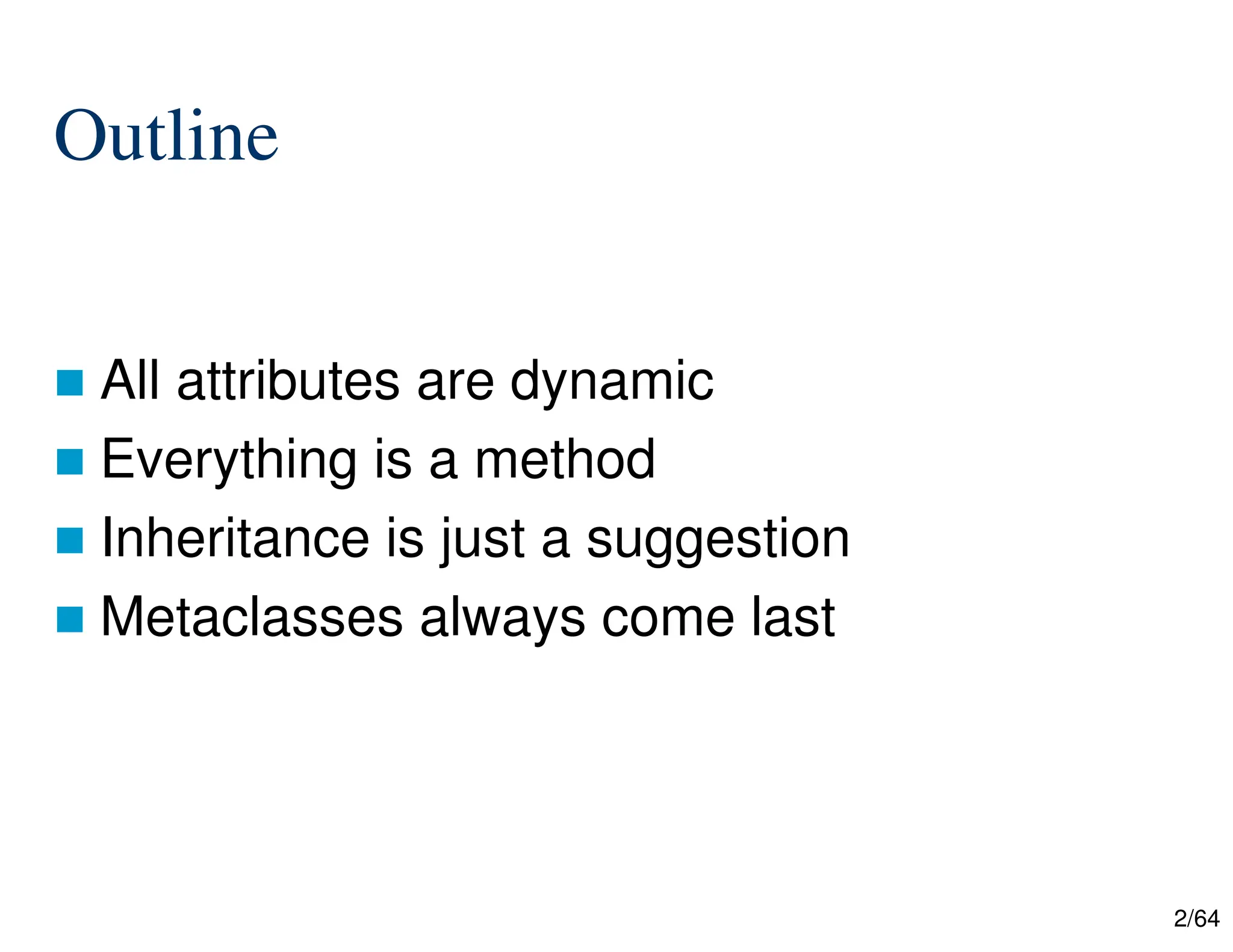 The document outlines key characteristics of Python, emphasizing that all attributes are dynamic, everything functions as a method, inheritance is flexible, and metaclasses have a specific order of execution. It provides examples demonstrating how Python handles class and instance variables, along with the behavior of instance, class, and static methods. The content aims to clarify common misconceptions and showcase Python's unique object-oriented features.