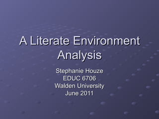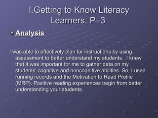 The author analyzed their use of literacy assessments and lesson planning approaches for early reading students. Running records and the Motivation to Read Profile were used to understand students' cognitive and interest levels to better plan instruction. A literacy matrix was utilized to select texts at different ability levels. Lessons focused on teaching decoding, comprehension strategies, and metacognition to promote independent learning. Both critical thinking and response perspectives were incorporated to foster deeper analysis and connections to texts.