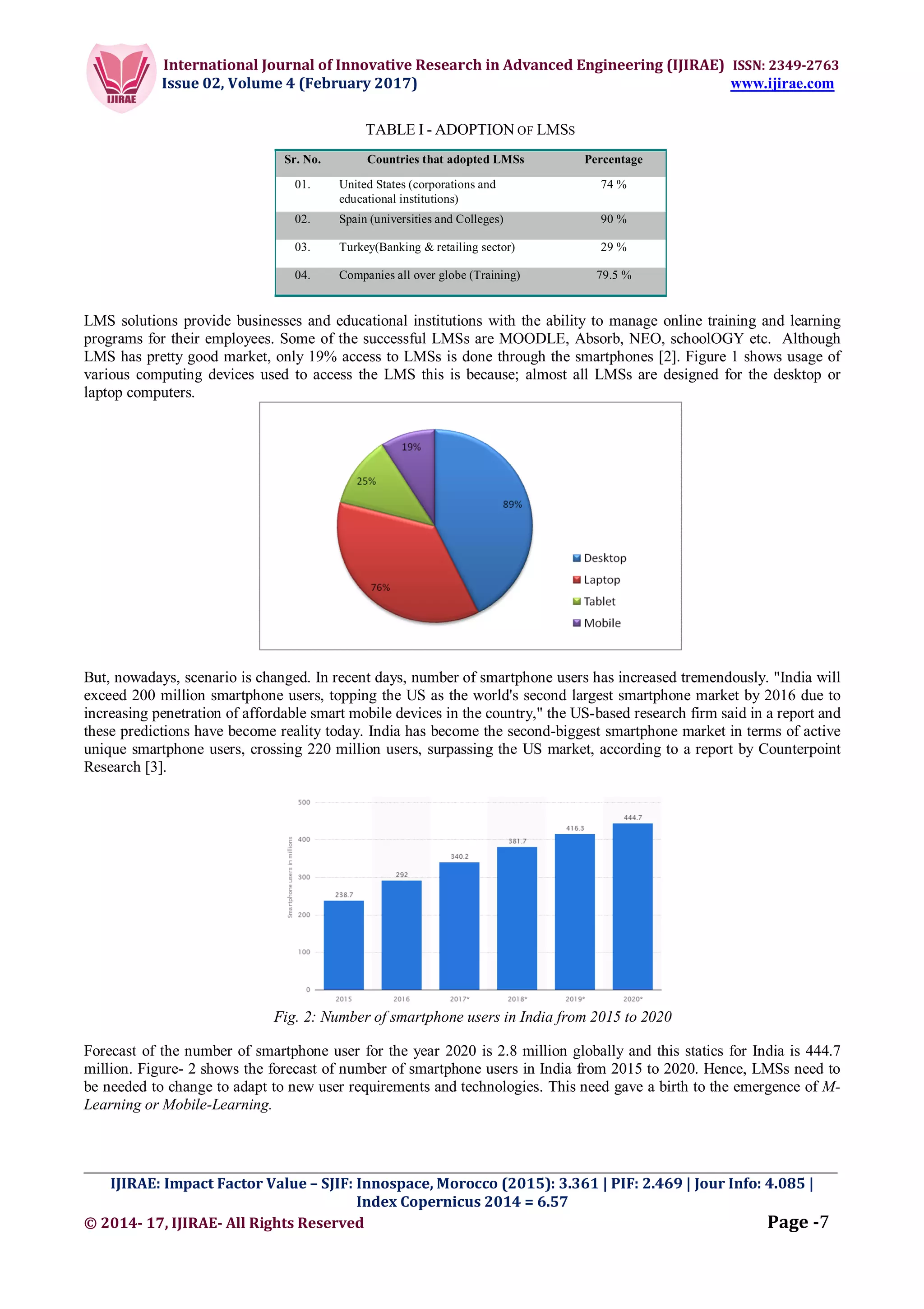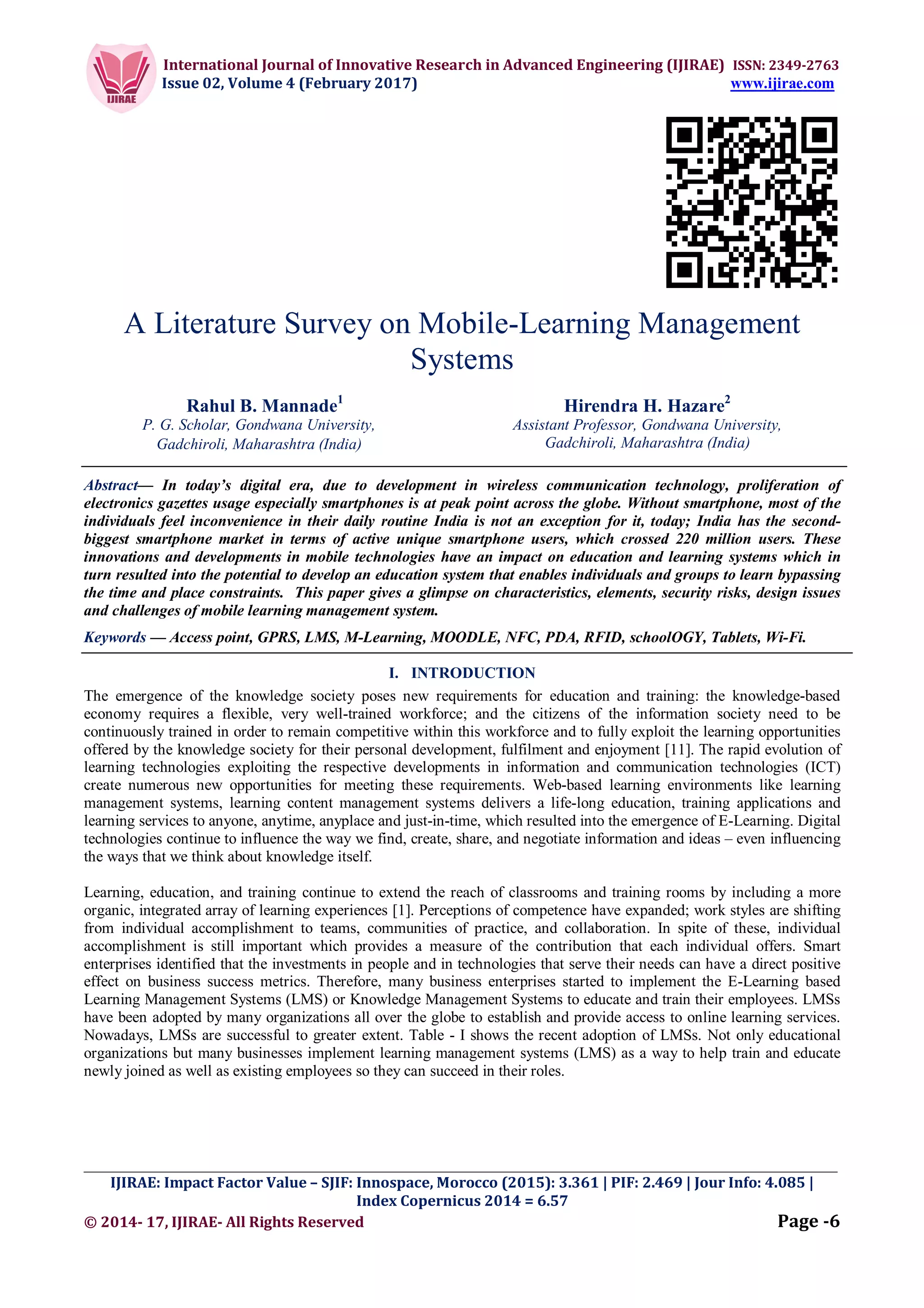 The document discusses the transformation of education through mobile learning management systems (LMS) driven by the growth of smartphone usage, particularly in India. It outlines the characteristics, elements, and challenges of mobile learning, highlighting the need for LMS to adapt to new technologies and user requirements. The paper also addresses various technical and security concerns associated with mobile learning, alongside the advantages it offers in terms of accessibility and engagement in educational environments.