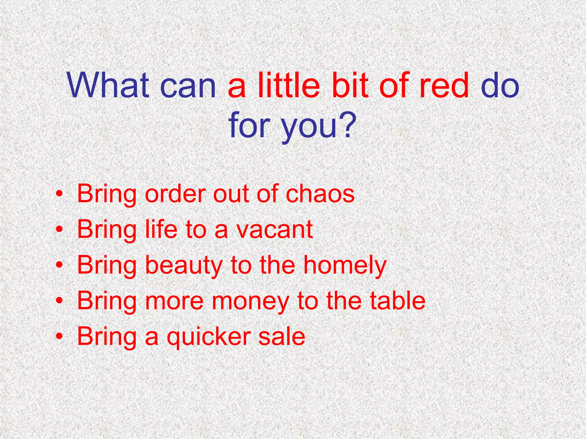 This document discusses how interior staging can help sell a home by bringing order, life, beauty, and more money to the table. It claims that staging can increase the sale price by 3-10% and sell homes 50% faster. Staging takes the stress out of preparing a home by renting furniture and accessories or fully decorating rooms. It suggests that a $150 staging consultation can provide peace of mind and multiple benefits to home sellers.