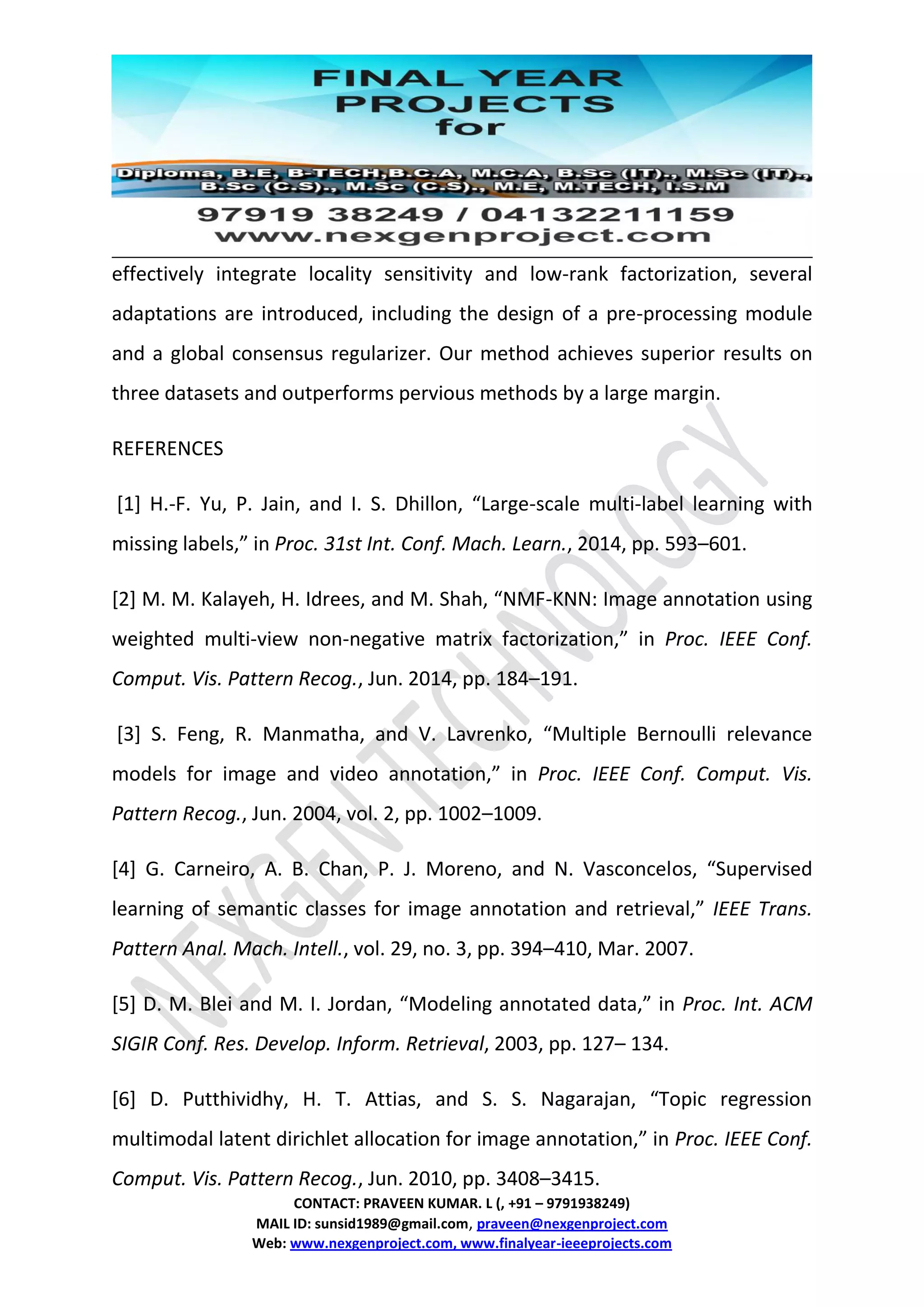 This document presents a locality sensitive low-rank model for image tag completion, addressing the issue of imprecise and incomplete tags in visual applications. The proposed method integrates locality sensitivity with low-rank matrix factorization, demonstrating significant improvements over previous techniques across three datasets. Key adaptations, including a pre-processing module and global consensus regularizer, are introduced to enhance model performance and mitigate overfitting.