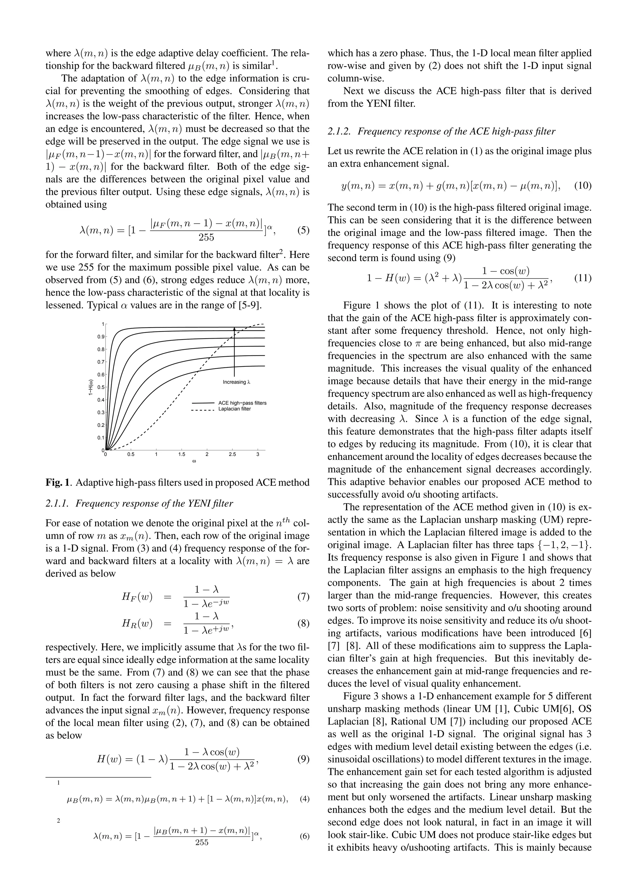 This document proposes a locally adaptive nonlinear (YENI) filter for image local contrast enhancement. The YENI filter adapts to local edge information to find the unsharp mask of an image, preserving edges while filtering out mid-range details. This avoids overshooting/undershooting artifacts often seen with other techniques. The YENI filter is implemented as a single-pole infinite impulse response filter at each pixel location, keeping computational complexity low. Experimental results on real video show improved visual quality compared to other methods, both subjectively and objectively.