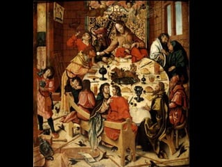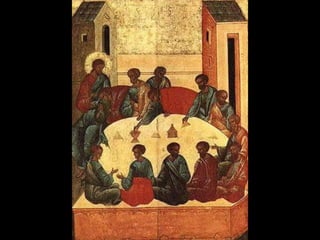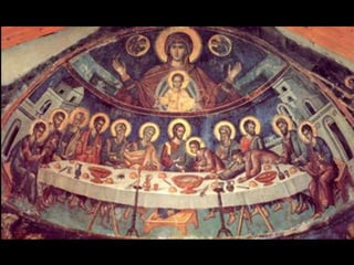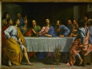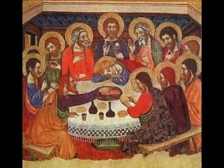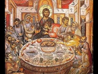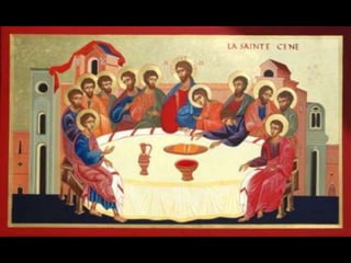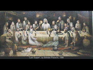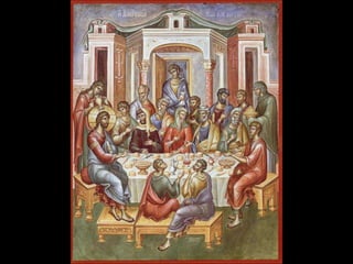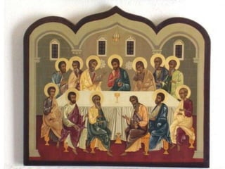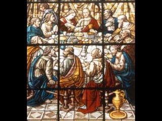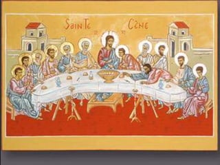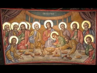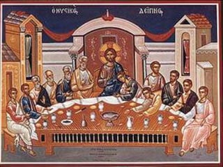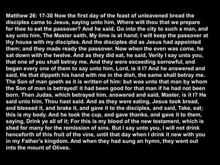 The document summarizes the account of the Last Supper from the Gospel of Matthew. It describes how Jesus and the disciples prepare to celebrate Passover. At the meal, Jesus tells them that one of them will betray him. He identifies Judas as the betrayer. Jesus then institutes the Eucharist by blessing and breaking bread, saying it is his body, and sharing a cup of wine saying it is his blood shed for the forgiveness of sins. After singing a hymn, they go to the Mount of Olives.