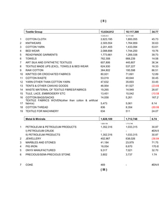 2. Textiles, worth $13.63 billion, accounting for 34.77% of total exports.