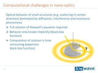 The document describes a machine learning method for efficient design optimization in nano-optics using Gaussian process regression and Bayesian optimization. It discusses how Gaussian process regression can be used to build regression models from expensive black-box functions to enable model-based optimization and integration. Bayesian optimization is then used to iteratively query the black-box function at points of maximum expected improvement to find its minimum. The method can incorporate derivative observations to speed up optimization by providing additional training data for the Gaussian process. Differential evolution is also utilized to efficiently maximize the expected improvement at each iteration. The approach is demonstrated on benchmark optimization problems, showing it outperforms other algorithms like L-BFGS and particle swarm optimization.