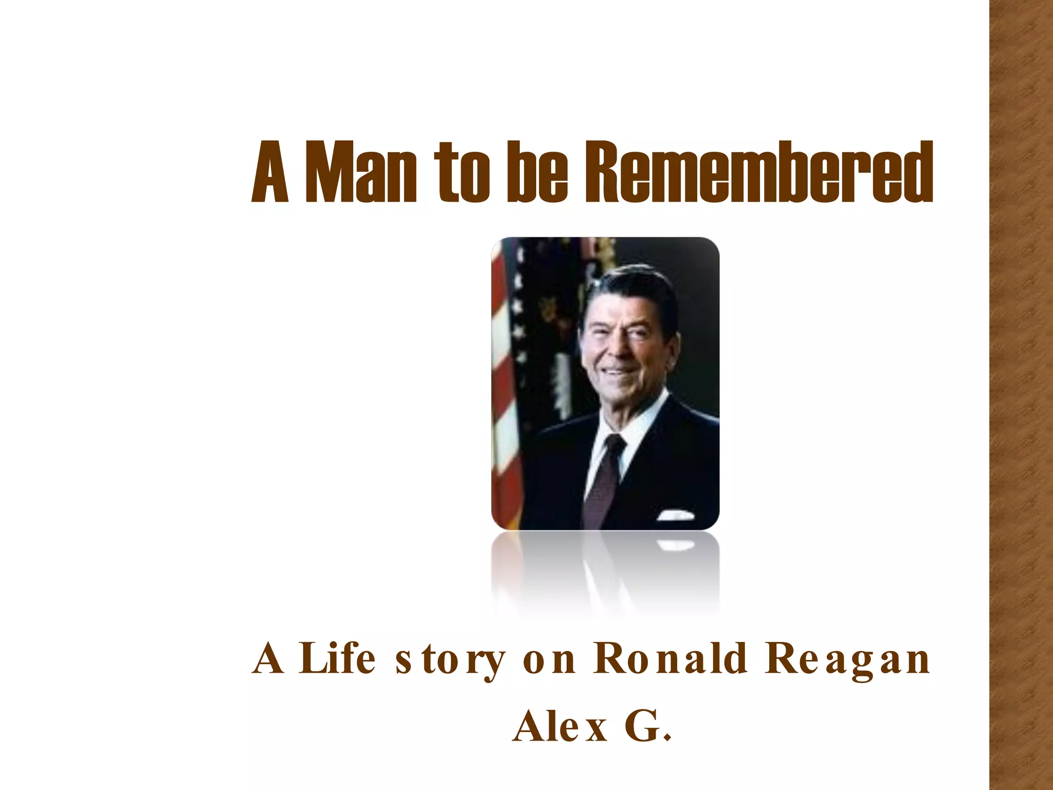 Ronald Reagan was born in 1911 in Illinois and was involved in many extracurricular activities in school. He attended Eureka College and had a career as a radio newscaster during the Great Depression before becoming a Hollywood star, appearing in over 50 films and becoming president of the Screen Actors Guild. Reagan switched from the Democratic to the Republican party and was elected governor of California, then president of the United States in 1980 and 1984. He accomplished much but his life and legacy eventually came to an end.