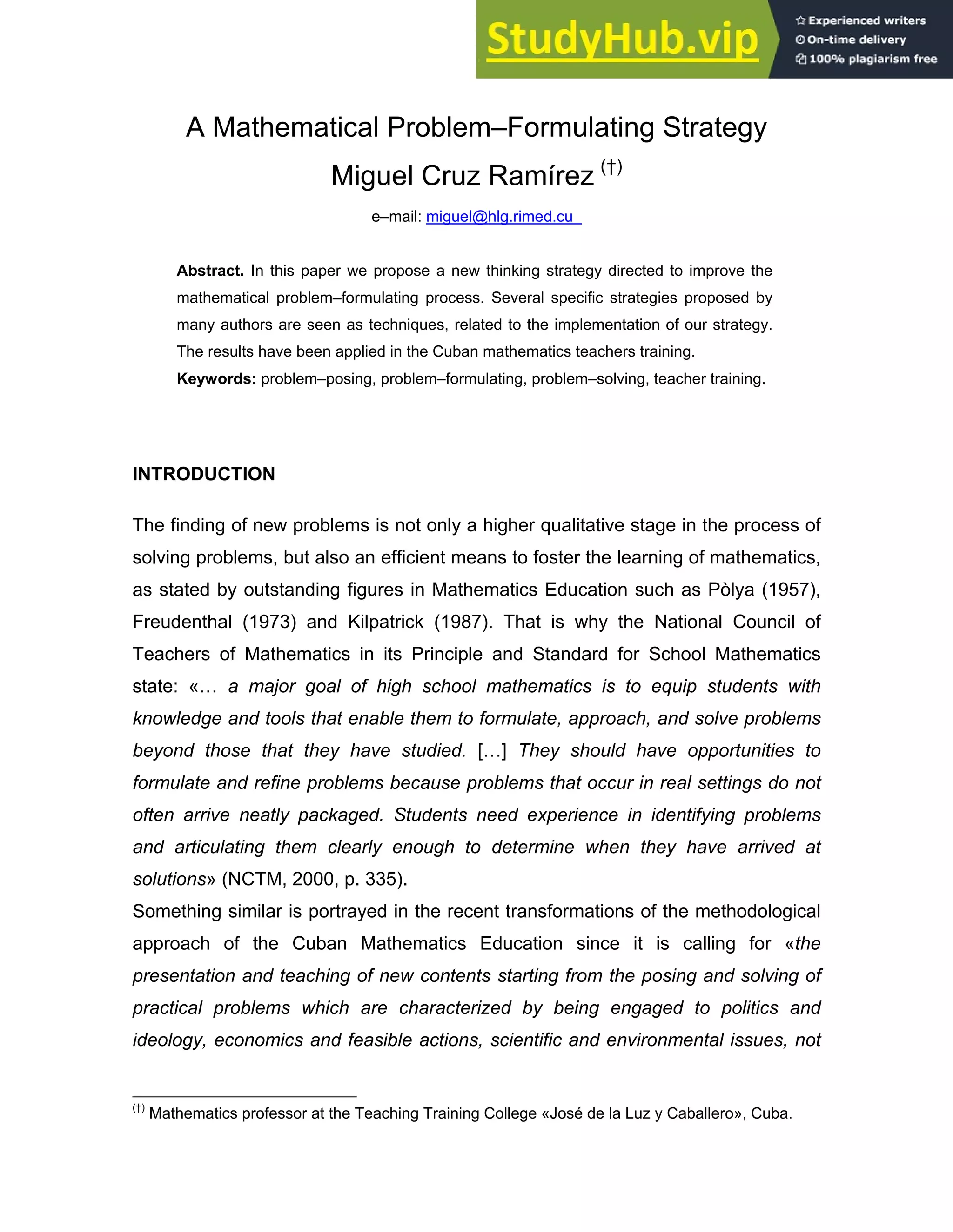 This document proposes a strategy for improving the mathematical problem-formulating process. It begins by discussing the importance of problem-posing in mathematics education. It then describes a study that found teachers and students had difficulties posing new problems. The document proposes a six-step strategy for problem-posing: 1) selecting an object, 2) classifying components, 3) transforming the object, 4) associating concepts, 5) searching for dependencies, and 6) posing a question. It argues that problem-posing is a complex cognitive activity and discusses how to analyze students using this strategy.
