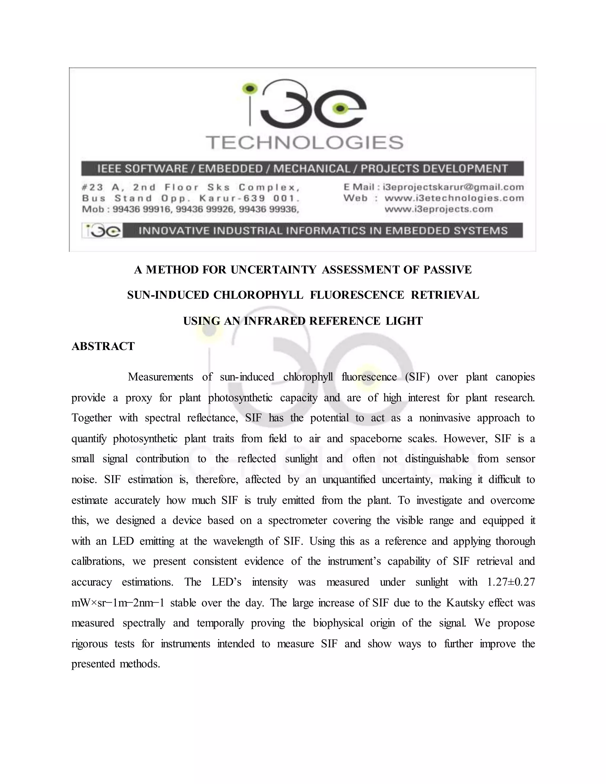 The document discusses a method for assessing uncertainty in the retrieval of sun-induced chlorophyll fluorescence (SIF) from plant canopies, which serves as a proxy for photosynthetic capacity. It details the development of a spectrometer-based device that employs an LED reference light to improve the accuracy of SIF measurements, addressing issues related to sensor noise. The findings include consistent retrieval capabilities and proposals for rigorous testing and enhancement of SIF measuring instruments.