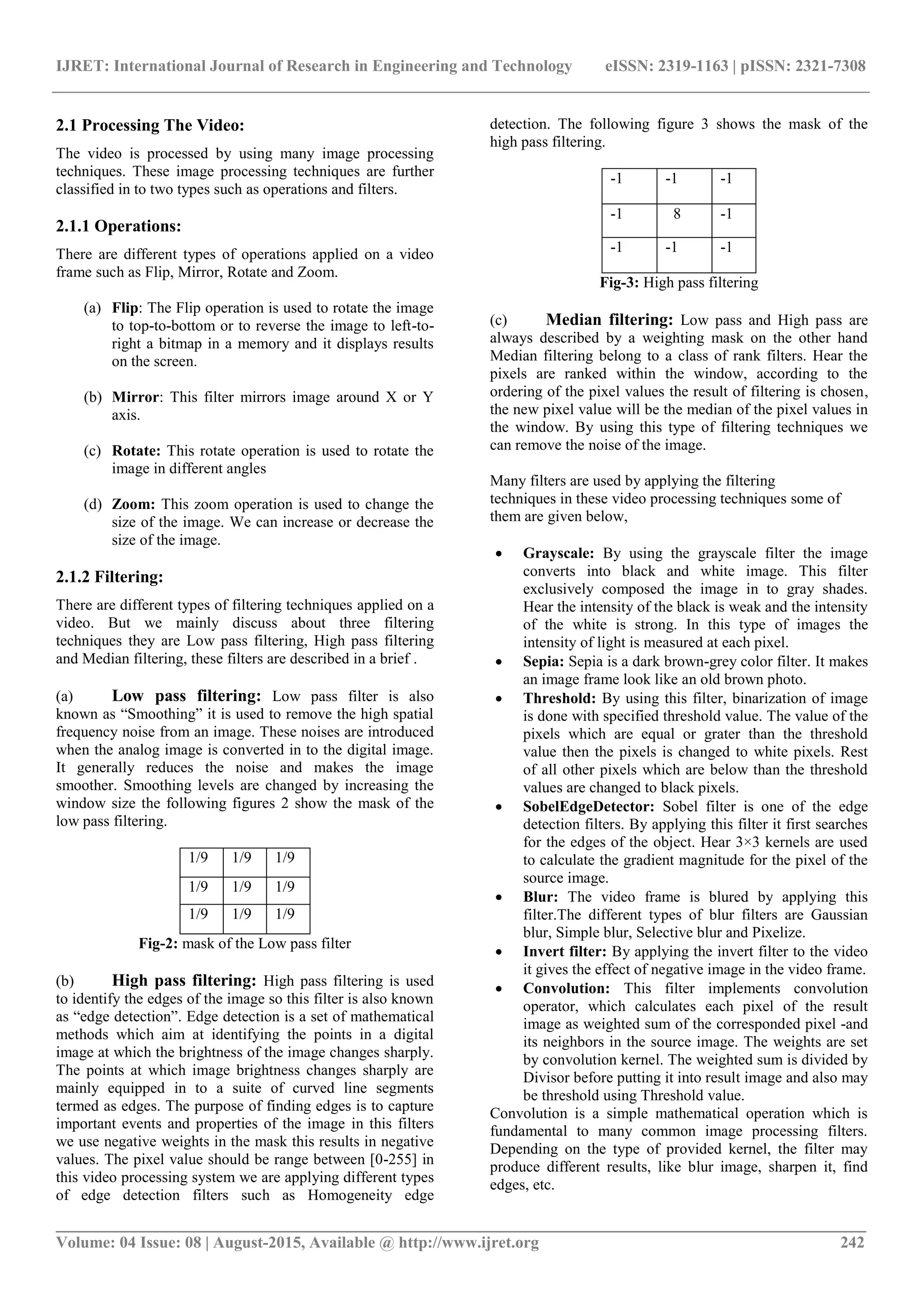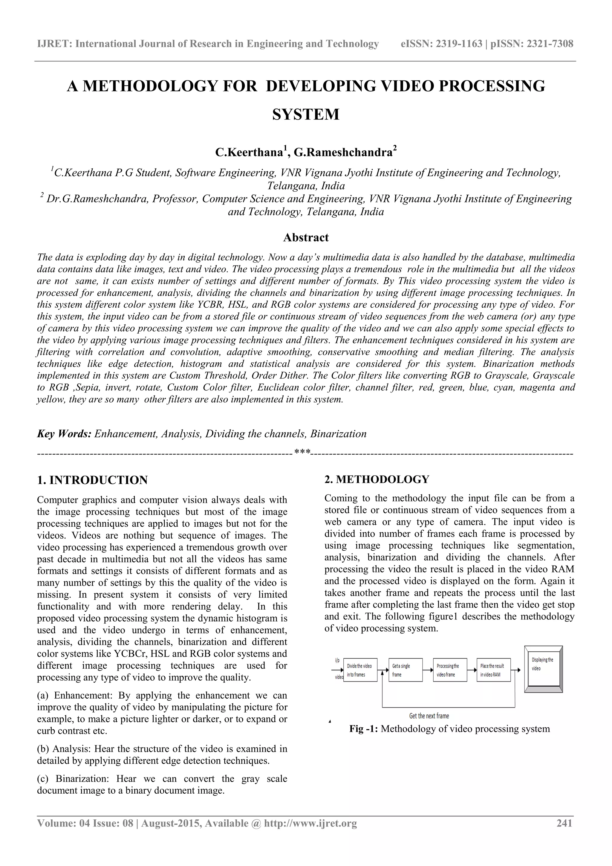 The document presents a methodology for a video processing system that enhances, analyzes, and binarizes video inputs using various image processing techniques. It outlines the implementation of different filters and operations to improve video quality, including edge detection, color transformations, and noise reduction. The system allows input from various sources and aims to provide future enhancements such as 3D video processing and additional functionalities.