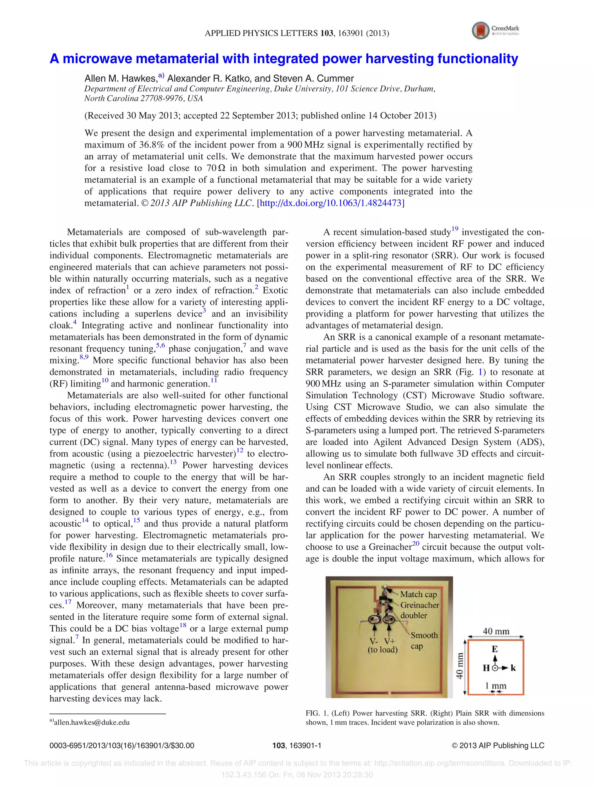 This document describes a power harvesting metamaterial that can convert incident radio frequency (RF) power to direct current (DC) power. A maximum of 36.8% of incident 900 MHz power was experimentally converted by an array of split-ring resonator (SRR) unit cells. Both simulation and experiment showed that maximum harvested power occurs for a resistive load close to 70 ohms. The power harvesting metamaterial demonstrates the potential for metamaterials to integrate power conversion functionality.