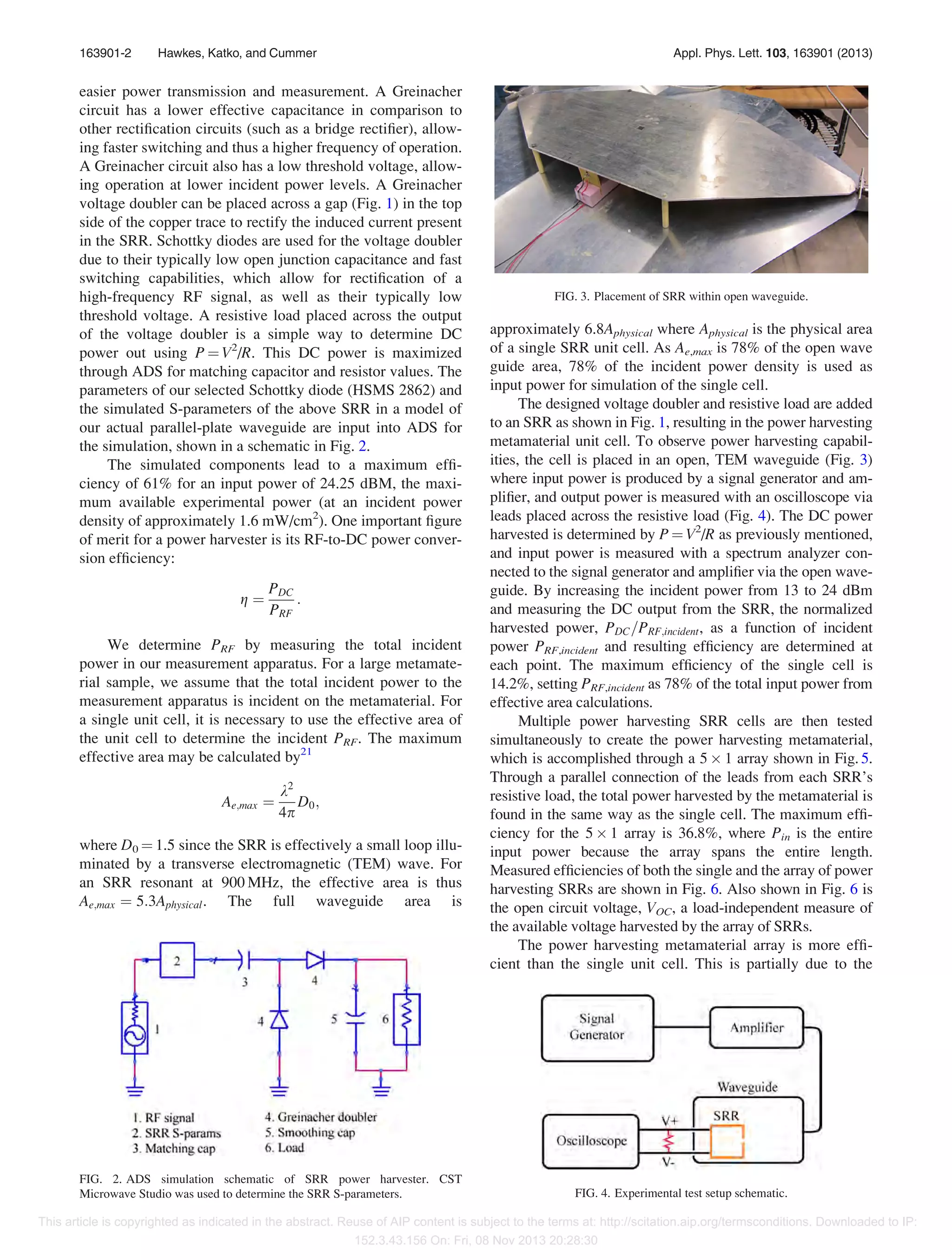 This document describes a power harvesting metamaterial that can convert incident radio frequency (RF) power to direct current (DC) power. A maximum of 36.8% of incident 900 MHz power was experimentally converted by an array of split-ring resonator (SRR) unit cells. Both simulation and experiment showed that maximum harvested power occurs for a resistive load close to 70 ohms. The power harvesting metamaterial demonstrates the potential for metamaterials to integrate power conversion functionality.
