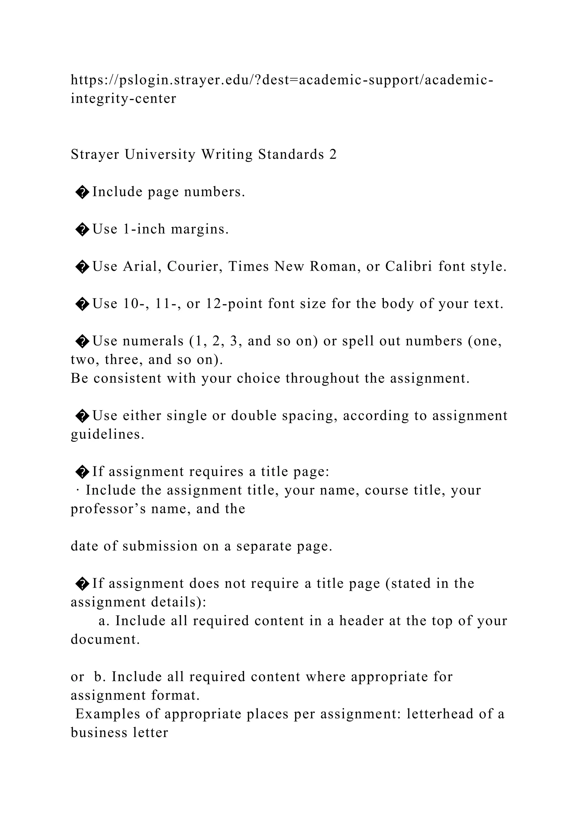 The document outlines guidelines for writing assignments at Strayer University, focusing on standards for formatting, citing sources, and maintaining academic integrity. It emphasizes the importance of using credible sources, avoiding plagiarism, and communicating professionally and ethically in written work. Specific instructions are given for various types of assignments, including papers, essays, and presentations, with a detailed explanation of citation practices.