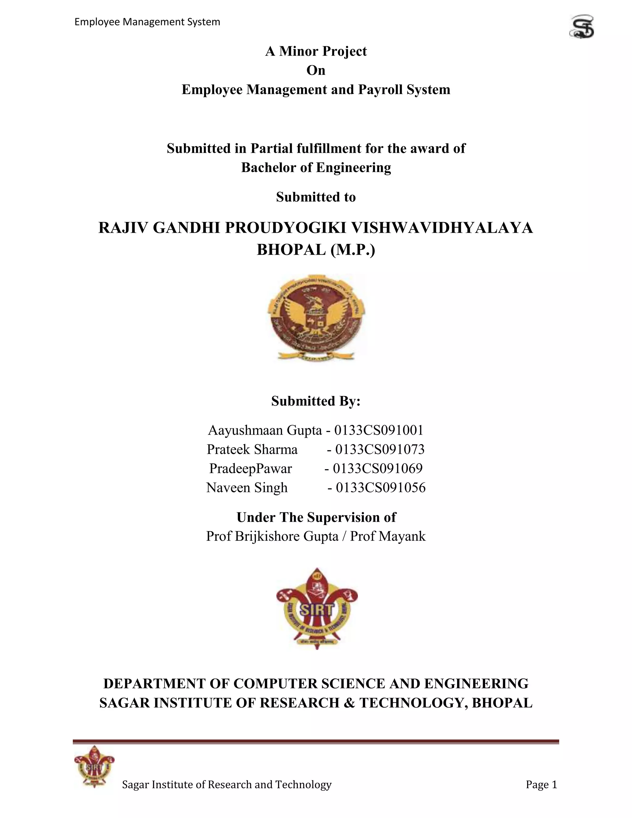 The document is a project report on an Employee Management System. It was submitted by 4 students to fulfill the requirements for a Bachelor of Engineering degree. It includes chapters on introduction, analysis, design, coding, testing and conclusion of the employee management application. The system allows users to manage employee records, payroll, attendance and generate reports.