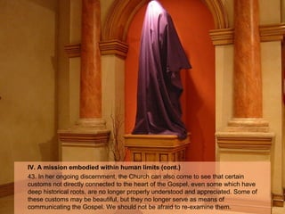 Pope Francis discusses how the Church can re-examine certain customs that are no longer effective means of communicating the Gospel. He notes that while the Church has rules that were quite effective historically, they may no longer be useful for guiding people's lives today. Citing St. Thomas Aquinas and St. Augustine, he argues that Church precepts should be insisted on with moderation so as not to overburden people. The task of evangelization operates within language and circumstances, constantly seeking to communicate Gospel truth in context without compromising truth. A missionary heart is aware of human limitations and strives to do good however it can.