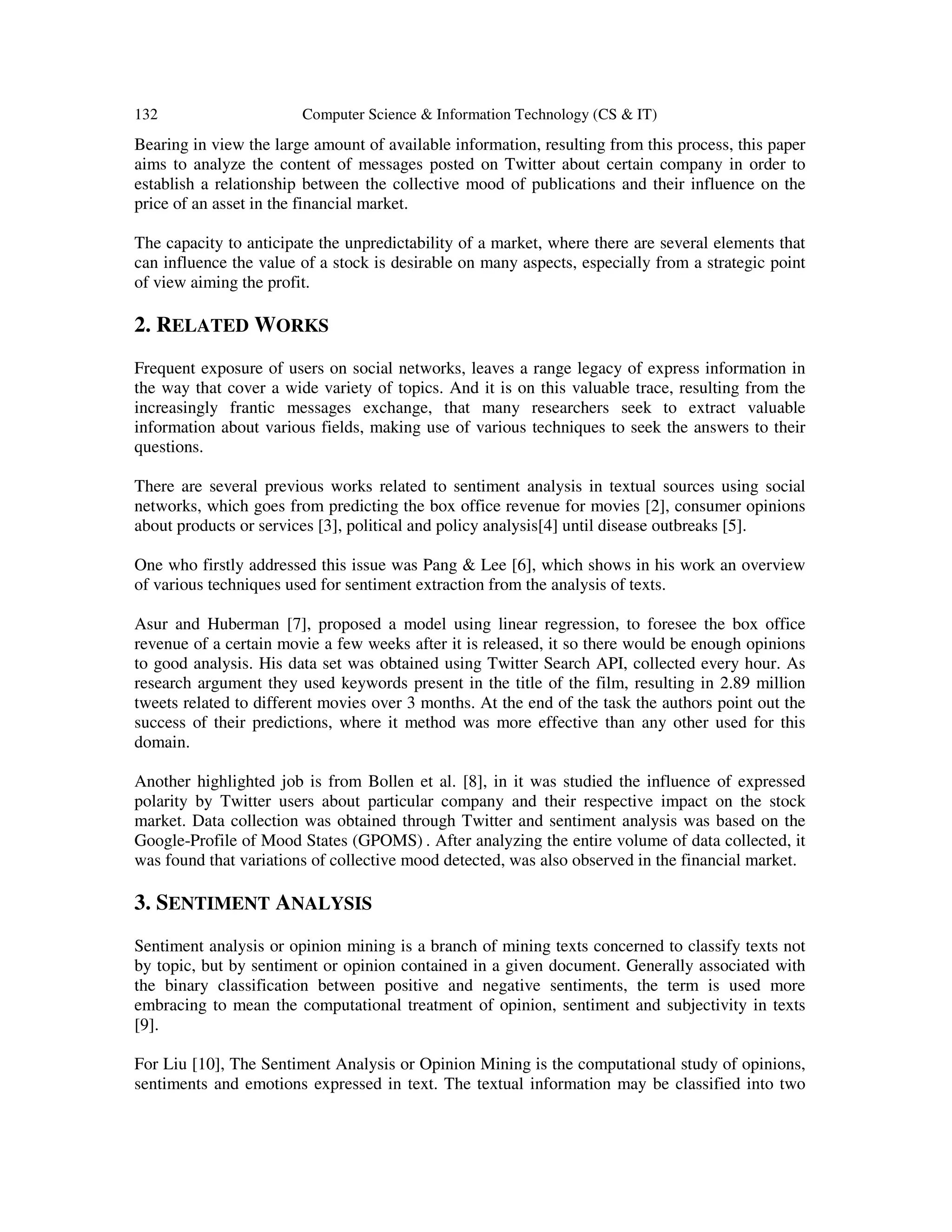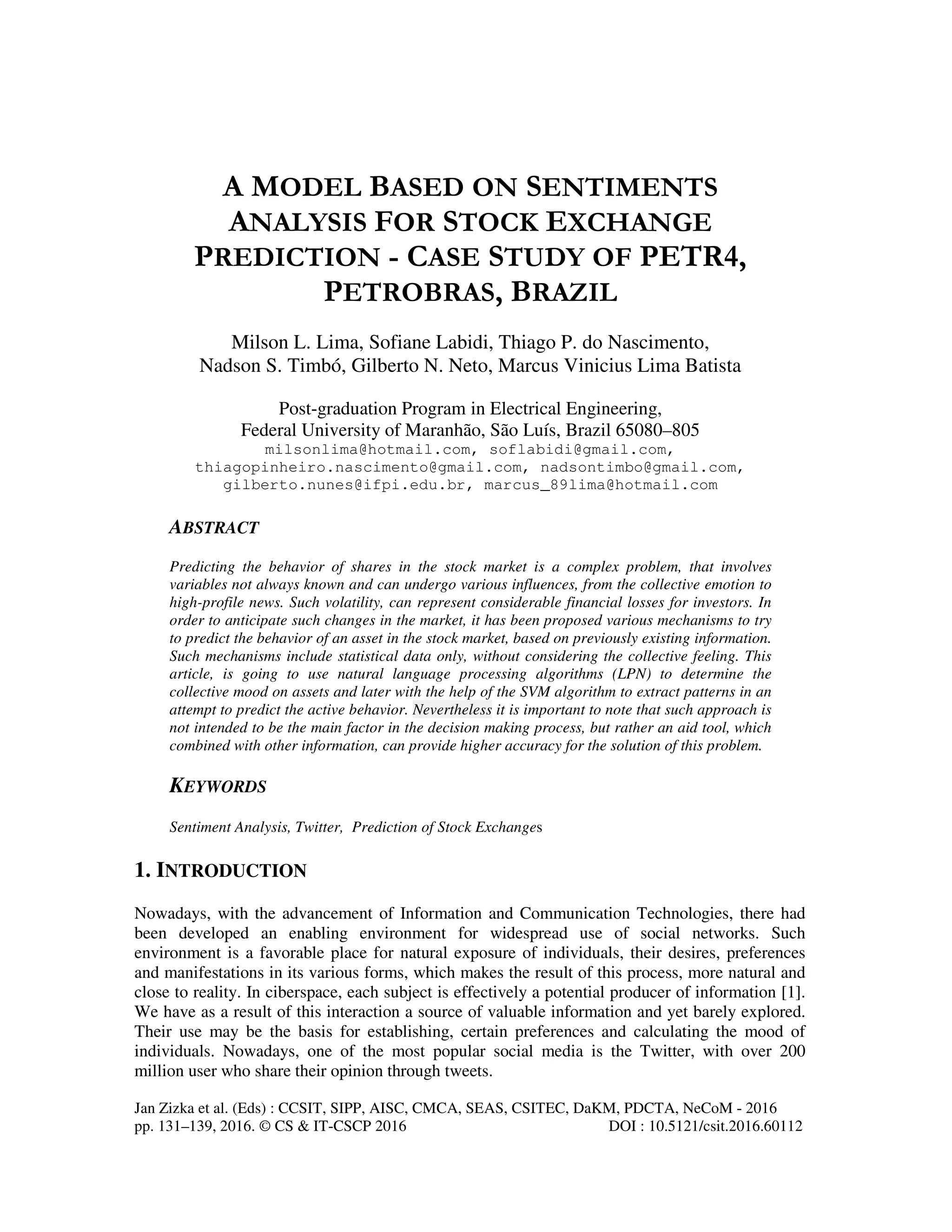 The document discusses a model for stock market prediction using sentiment analysis based on Twitter data, specifically focusing on Petrobras in Brazil. Utilizing natural language processing and the SVM algorithm, the study aims to analyze the collective mood of users' tweets and its correlation with stock prices. The findings emphasize the need for careful data treatment due to the complexities of language and the political context surrounding Petrobras, suggesting that sentiment analysis can be a supplementary tool in investment decision-making.