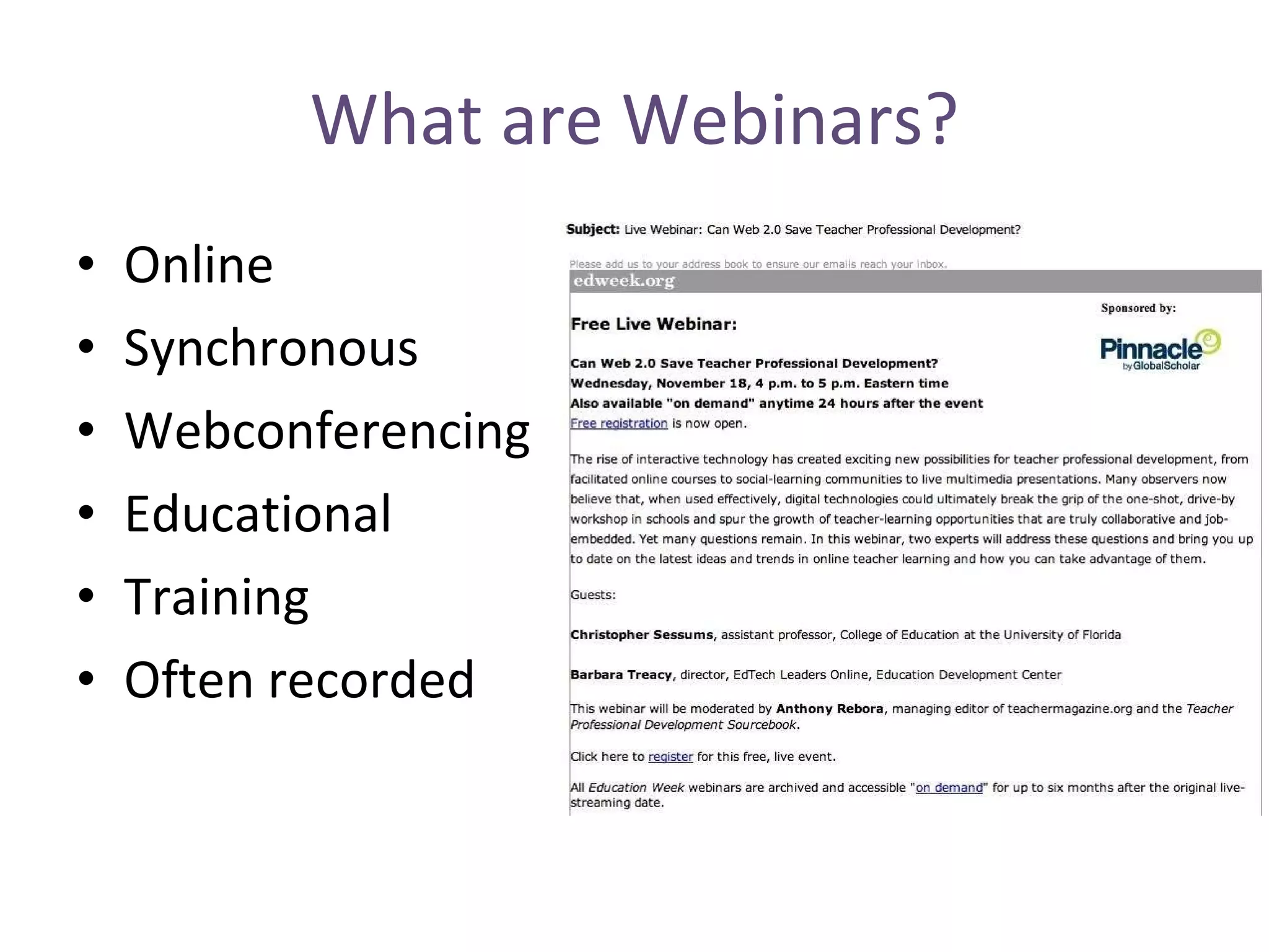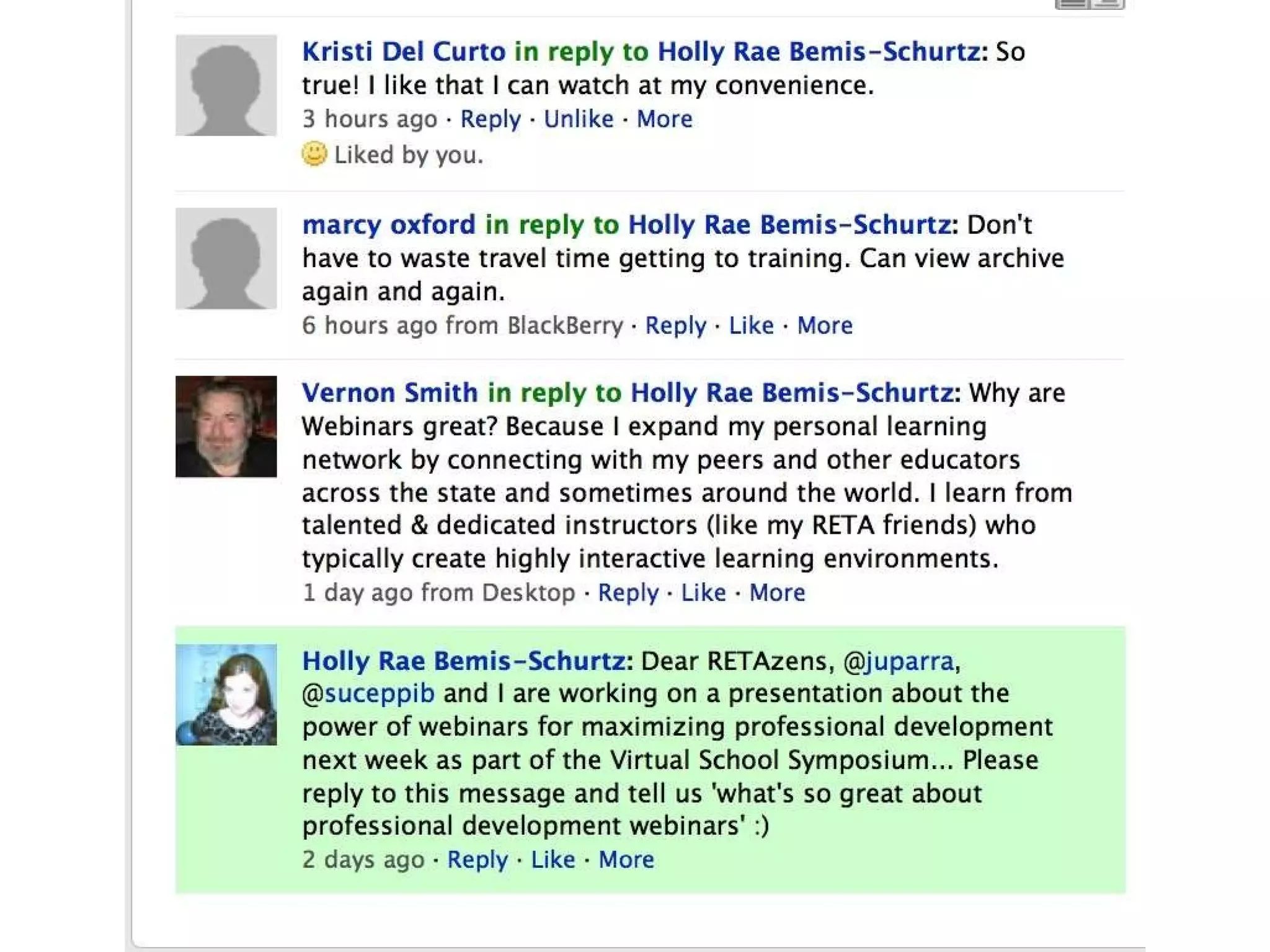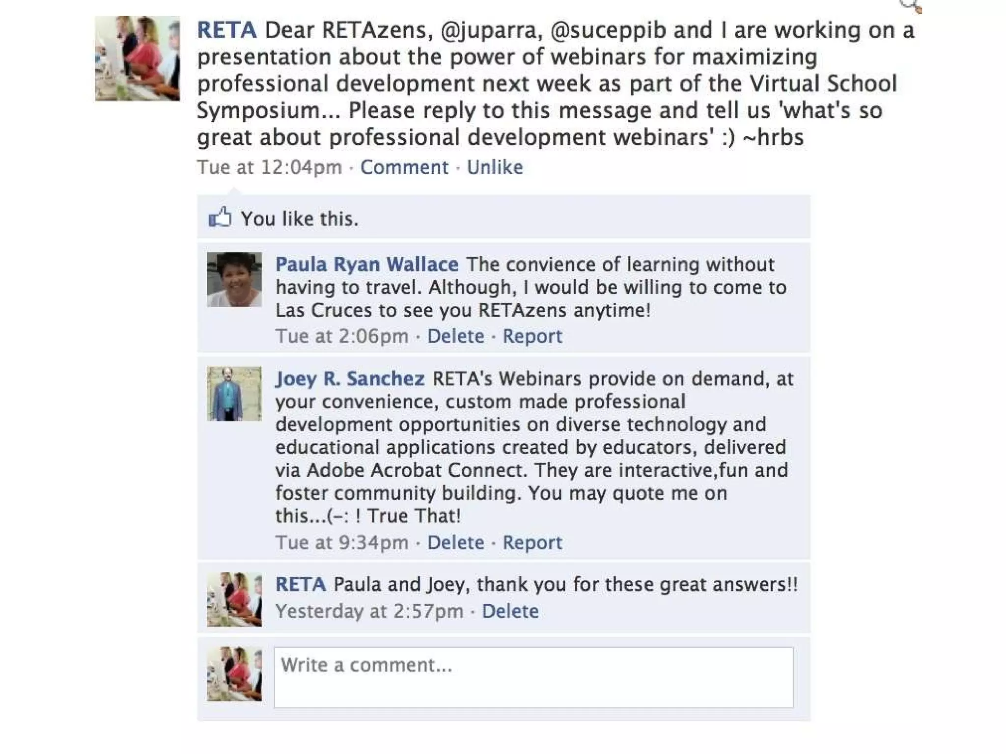 The document outlines a model for professional development through webinars by the RETA team, highlighting the benefits of using platforms like Adobe Acrobat Connect Pro for online learning and collaboration. It addresses challenges in scheduling, topic selection, and reaching audiences, while emphasizing the importance of relationships and knowledge management. Contact information for team members is provided for further inquiries.