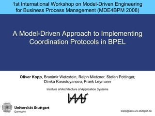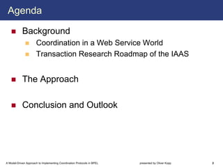 The document describes a model-driven approach to implementing coordination protocols in BPEL. It presents a method to model coordination protocols as Coordination Protocol Graphs (CPGs) and then automatically generate abstract BPEL processes for the coordinator and participants. These abstract processes are then manually refined into executable BPEL code. The approach represents states and transitions for participants as BPEL processes and uses events and conditions to model the coordinator's management of registrations, activations, and protocol completion. The conclusion discusses future work on supporting loops, coordinator hierarchies, and mixed protocols.