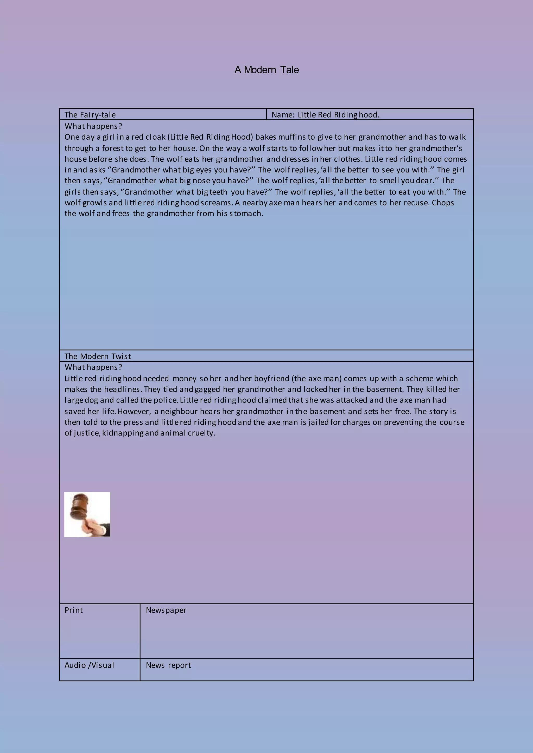 Little Red Ridinghood bakes muffins for her grandmother but must walk through a forest to deliver them. A wolf follows her and arrives at the grandmother's house first, eating her and dressing in her clothes. When Little Red Ridinghood arrives, she has an exchange with the wolf before screaming for help. A nearby woodcutter hears and rescues them by chopping open the wolf's stomach. In the modern version, Little Red Ridinghood and the woodcutter devise a scheme to kidnap the grandmother for money and fame but are discovered and jailed.
