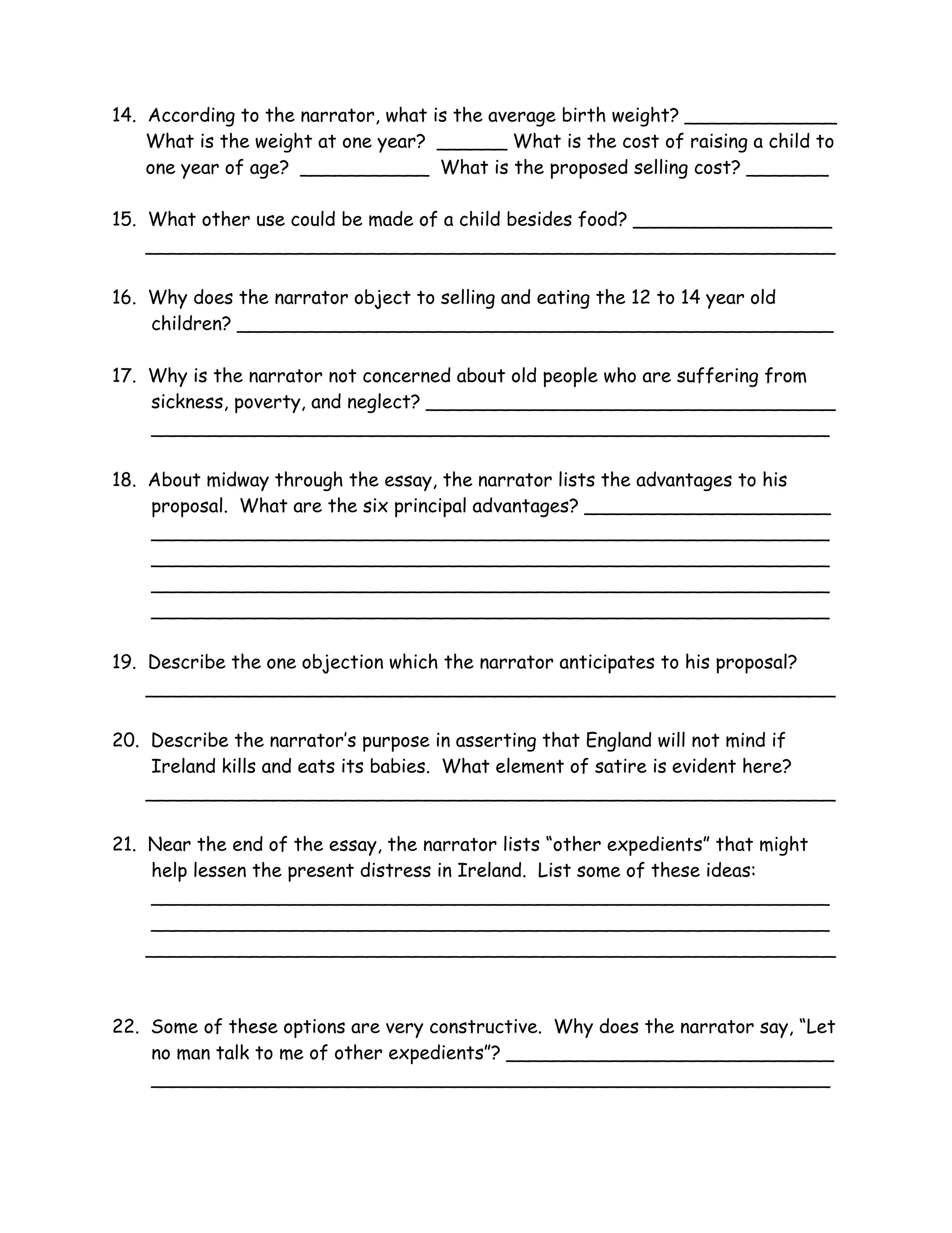 Swift proposes a satirical solution to poverty and overpopulation in Ireland - selling impoverished children as food. He argues infants would provide a good source of nourishment, and their bodies could be sold for profit. While outrageous, Swift's proposal highlights the suffering of Ireland's poor and criticizes a society that fails to address such immense human hardship and loss of life.