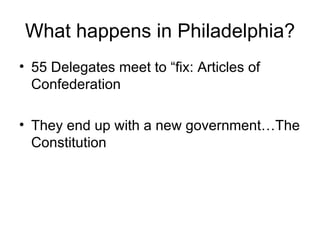 Delegates met in Philadelphia to revise the Articles of Confederation but instead created the U.S. Constitution. The Constitution established a new national government with three branches of power and a system of checks and balances. It was a compromise between large and small states on issues like representation and slavery. The Constitution was ratified after debate between Federalists, who supported it, and Anti-Federalists, who initially opposed it without a bill of rights.